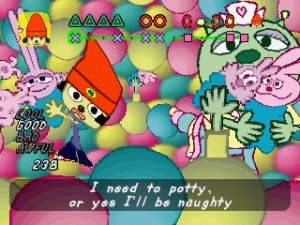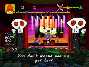 A few changes were made to Um Jammer Lammy‘s American release compared to its Japanese/European counterpart. Some of the lyrics were changed, such as lines in stage five that referred to deforestation in a gleeful way. The most infamous changes came with stage six, for its opening cutscene – in the original version, Lammy literally dies and goes to hell; while the American version has her being sling-shot to a distant island. Despite these wildly disparate themes and settings, the actual levels and the songs haven’t changed.
