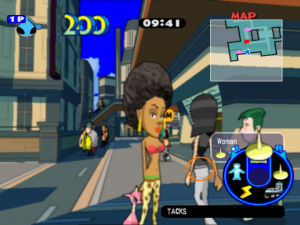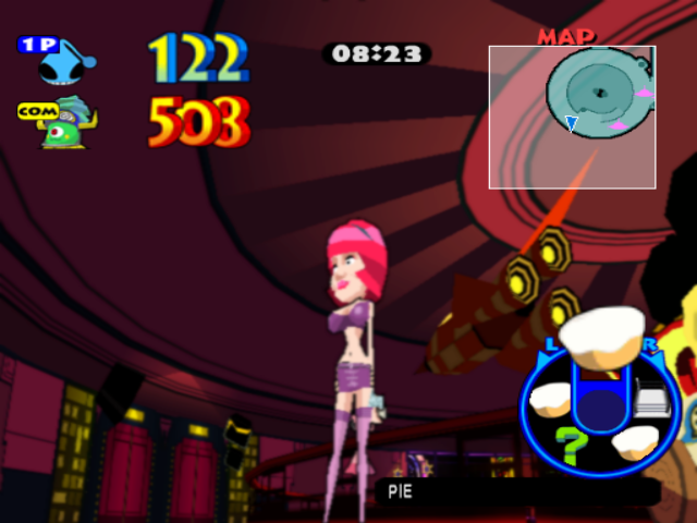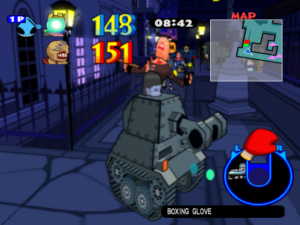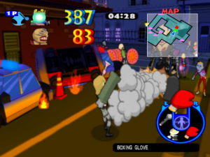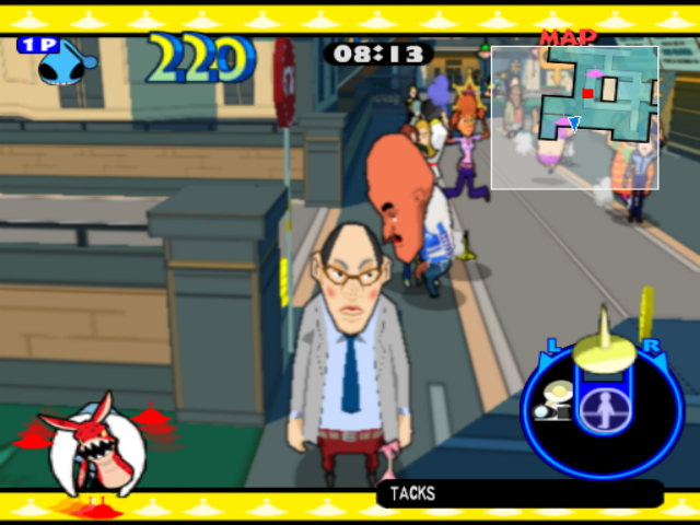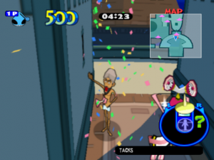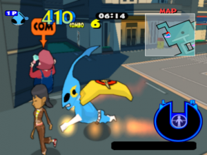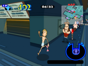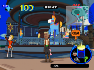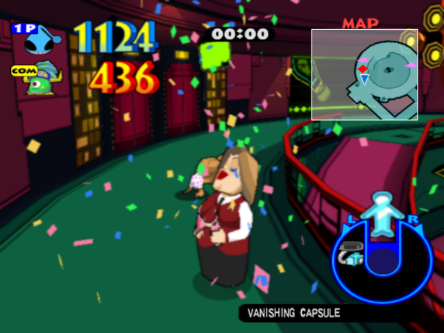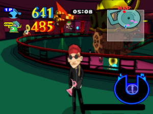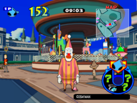 Developed and published by Capcom in 2004 exclusively for the PlayStation 2, the game follows Cosmi, a blue alien who crash-lands on Earth only to be told that his true purpose is to sow disorder and, in doing so, impress his father. From there, the premise unfolds in straightforward fashion: you’re dropped into compact levels with one goal — cause trouble. The levels are quite varied (city streets, casino, desert town and more), but nothing about them impresses much. You can attack unsuspecting humans, set traps with bombs, needles, or other trick items, and collect the coins they drop. The catch is that you’re not alone; a rival alien is after the same prize, and you can just as easily slug them in the face to snatch their earnings. Whoever has the biggest haul at the end wins.
