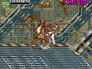 Unfortunately, the game can become quite frustrating. Enemies often have a habit of hovering just out of your reach, and then almost exclusively attack with fast lunging attacks with little to no windup. Even fighting the low-level mooks often feels like the early days of fighting game AI, where the computer would know exactly what you’re going to try and would always know the perfect thing to foil your plans. It’s not completely insurmountable, and there’s just enough you can exploit that you can properly learn the patterns and finish the game on one credit. The difference between this and your typical Capcom brawler, however, is that the game demands a constant vigilance to stick to these patterns. If you don’t, you’ll constantly get knocked around by foes, often ending up in loops where the same foe might knock you down multiple times in a row. Either way, it can get rather draining – especially considering that the game’s final stage lasts almost as long as all the previous stages combined. (A trait Nazca staff would see fit to bring back for Metal Slug 3.) The final stage also plays a rude surprise on you, where you find the game’s final villain attempting to drop his nuke from the air. Fail to interrupt him in time, and the bomb falls, you’re fired, game over – although one has to wonder who’s left to hand you the pink slip. Thankfully, it’s pretty easy to stop this, if you’re paying attention.