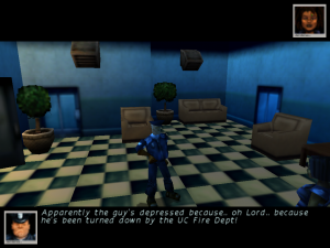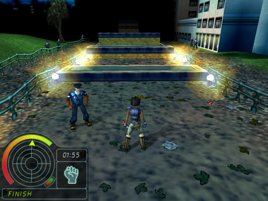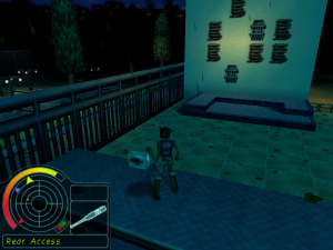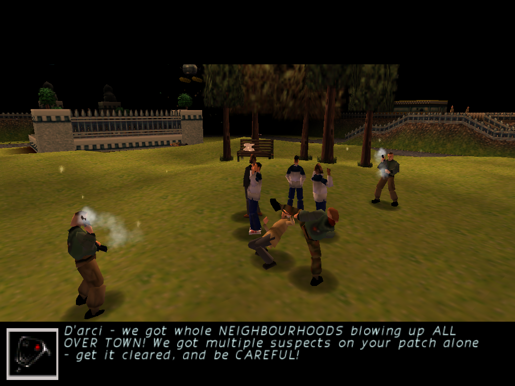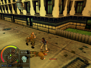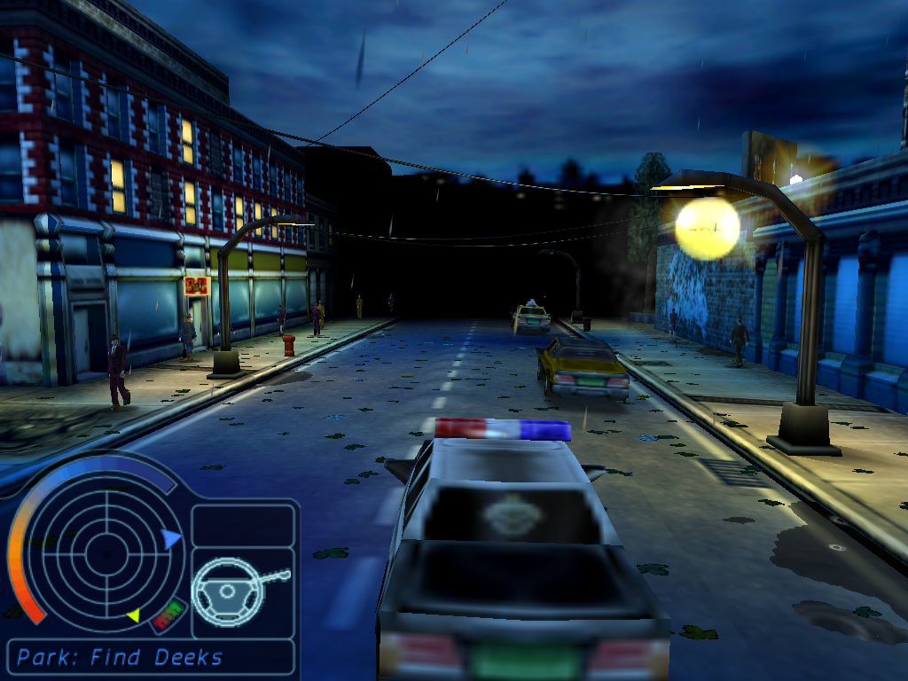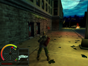 The camera has a cinematic, flowing quality that makes for cool in motion shots, especially when driving. Backing up makes the whole thing swing around and create a dynamic action shot, for example. However, this screws around with your understanding of left and right, or obscures your view of upcoming obstacles or dangers. Combined with your on foot momentum, this is a recipe for running into walls and jumping where you didn’t want to go, not to mention the camera refusing to go through buildings. Unlike, say, God Hand, which would apply transparency on textures and structures obscuring your view of your character, the Urban Chaos camera gets stuck on structures and makes rooftop exploration more of a challenge than it should be by forcing you into awkward angles.