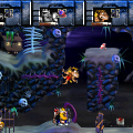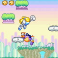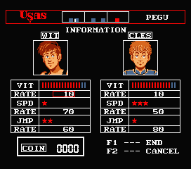 There are two playable characters, Wit and Cles, that each controls slightly different. Wit has a ranged attack (gun) whereas Cles relies on a melee attack (kick) with limited range. On top of this, there is a light RPG system where you can buy improved walking speed and jumping power with coins that can be collected in the stages. The health bar can also be replenished for the cost of 10 coins per bar, and this is the only means of healing. Saving up money for stats and healing will be crucial for making it through the game, especially since each character has his separate stats and health. When a character’s health bar runs out, he will be captured by the boss demon of the stage. If the player manages to beat the boss using the remaining character, both characters will return to the ruin. If the second character also dies/gets captured, the game is over.