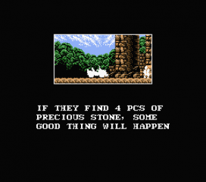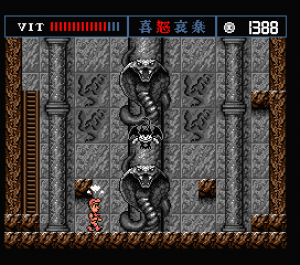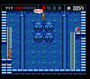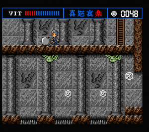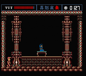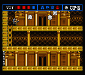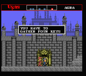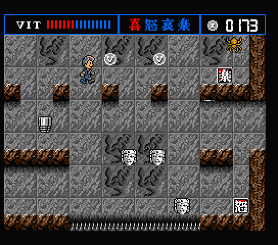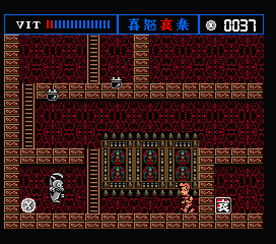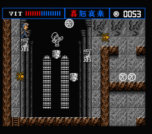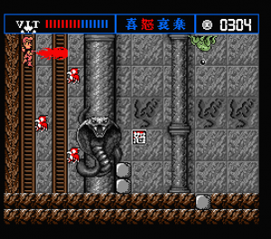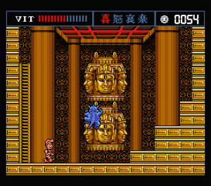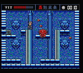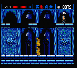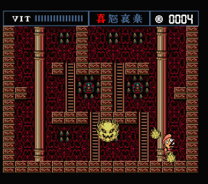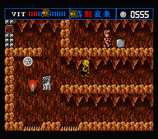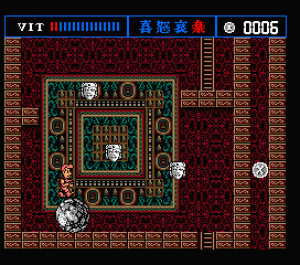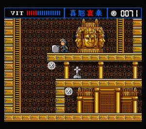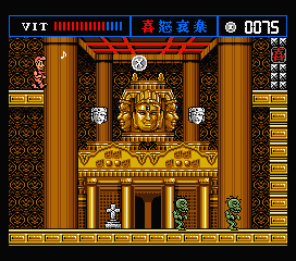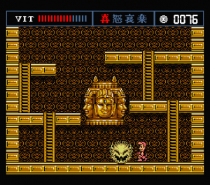 The premise of the game is to explore five different ruins to find the shattered pieces of the jewel, and then reach the statue of Uşas where the jewel will reveal a hidden treasure. Each ruin is basically a hub world with five doors. The first four leads to different multi-screen stages, where the goal is to find the correct emotion that opens the door to the boss’ room, take the key inside and defeat the boss demon. Do this for the four stages and the fifth door in the hub world unlocks. Inside is a single-screen room (The Temple; 神殿) with a statue that holds one of the pieces of the jewel. To no surprise to anyone who has ever seen an Indiana Jones movie, taking the jewel shard will trigger a trap; in this case the statue comes alive and tries to kill you. Once it’s defeated, you’ll proceed to the next ruin in search of the next piece of the jewel. You will also get a password that can be input at the title screen to send you directly to the new ruin.