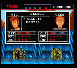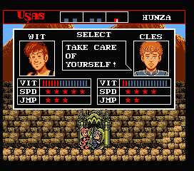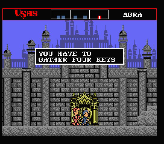 The graphics are charming and colorful, and you can tell that extra care has been put into the details. There are also a few cute animated cutscenes between the ruins that show how Wit and Cles struggle to reach their next destination by e.g. traversing rickety bridges and rafting over waterfalls. The music was composed Kinuyo Yamashita who had debuted as video game musician the previous year with her score for the original Castlevania. Although it was released the year prior to Uşas, this cartridge lacks the enhanced SCC sound chip found in a couple of Konami MSX2 games from the mid-to-late 1980s, and instead uses the MSX’s standard PSG sound chip. Like many other Konami games of the time, the music is truly excellent, and the pitch modifying effect of the mood system is a great touch.