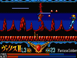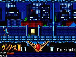On paper, these versions of Valis II have a much better design than the TurboGrafx-16 game. The stages are much more eventful (aside from the mandatory boring straight road in the first sub stage), even if some drag on for a bit too long. In two of the stages Yuko can fly around freely, while the screen keeps scrolling automatically like in a shoot-em-up. This constantly burns special item charges, though, and if Yuko runs out of them, she plummets to the ground, or, if she’s particularly unlucky, into a bottomless pit. The bosses are insane. They include a several screens large monstrosity with lots of horns and legs and shooting plant heads, and a Rogles follower who attacks from a giant Rogles robot.