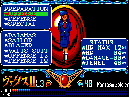 The powerup system has been much improved. There’s now a separate screen where players can choose from all the weapons Yuko has picked up so far, as well as from a range of different costumes. Most of them, like Yuko’s pyjamas from the first stage or her school uniform, are pretty weak and just there for the looks, but in addition to her Valis Suit, Yuko soon finds specialized “Offense” and “Defense” suits, which can be upgraded numerous times. Special support “weapons” are also stored here, and recharged by a point system similar to the one in Castlevania. If she finds the corresponding upgrades – some of them are actually well-hidden – Yuko can learn to stop time, become invincible for a few seconds, and even recharge a bit of her health.