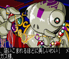 The other Valis II was made by Renovation Game for the old Japanese home computers, the MSX2 and PC-88. The first notable difference to Laser Soft’s offering is in the tone – it also tells the story of Megas’ invasion to Vecanti, but ramps up the sex and violence to previously unseen (in the Valis series) degrees. It’s the only game in the classic series to feature actual semi-nudity, and it’s also the most bloody of them all. Whereas the TurboGrafx-16 version depicts Megas as some kind of tragic anti hero who finally dies in Yuko’s arms, here he is a sick evil bastard with a mad robot chameleon as an adviser. On the TurboGrafx-16, Valia just dies in bed due to uncertain circumstances, but here Megas outright murders her bare-handedly by punching a hole through her chest.