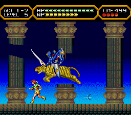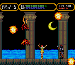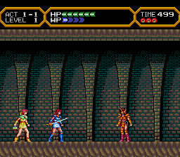 The game retains the feature with the three switchable characters from Valis III, and this time they play much more distinctively. Lena plays exactly like Yuko did before, so she attacks with a sword and can slide on the ground. Her tomboyish sister Amu has a boomerang-like weapon that flies in strange angles, and she can double jump. Asfal is actually Gallagher’s father, but he still wants to put an end to his son’s reign. As a demon, he is very big and bulky, and can walk right through hazards like spikes and energy barriers without getting hurt. His attack shoots blue wolf heads that slide over the ground and thus cannot hit flying enemies, but they are very destructive.