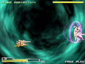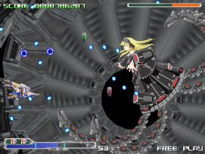 Valstar is mostly impressive because it features 2D Sprites on 3D, reminiscent of modern console shooters. It’s not exactly mind blowing – the look and feel suggest a low-rent version of Border Down – but again, it’s impressive considering that most doujin shooters are strictly 2D. The sprites don’t fare quite as well – they’re gaudy and poorly detailed. Plus, the game shoehorns an unnecessary moe factor by featuring cute little girls melded with spaceships, mechas and other bizarre creations. Most of it looks quite bad and severely out of place with the rest of the visuals. It’s also more disturbing than anything else – what exactly are you supposed to think of a floating gothic lolita chick with robotic tendrils flowing from beneath its skirt?