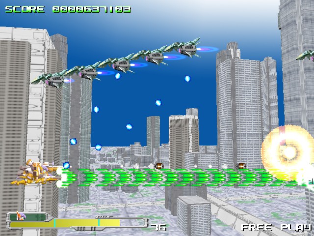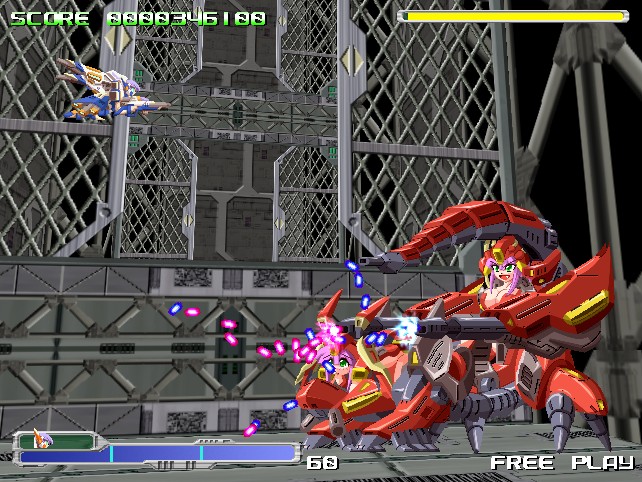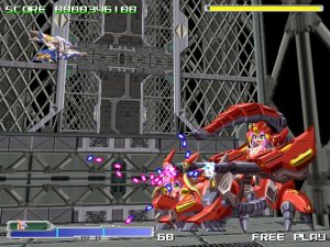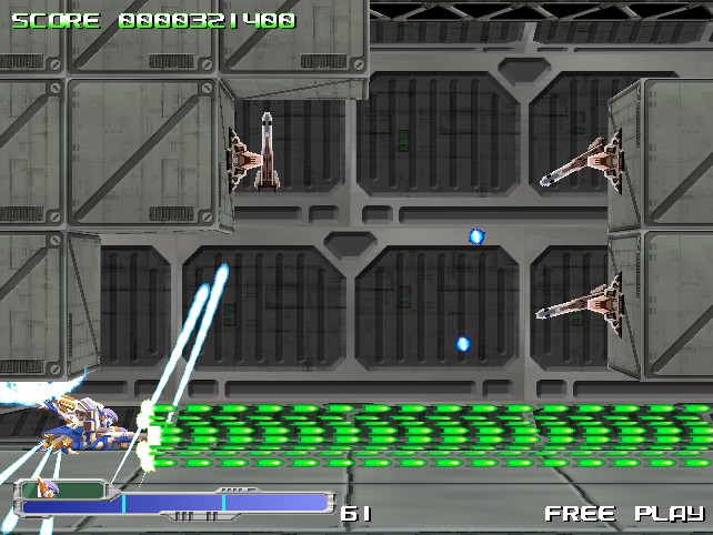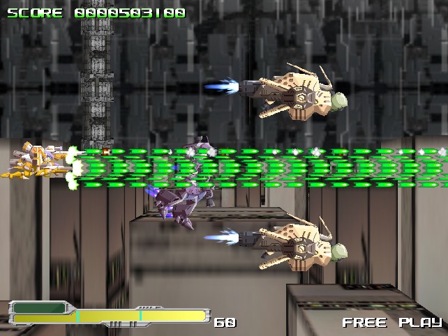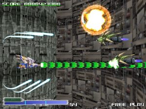 Beyond that, though, it’s pretty standard fare. There are only two buttons – a rapid fire attack and non-rapid fire attacks – and no bombs. The weapon system is similar to the likes of the TG16 Star Soldier games, with three colored emblems that can be collected and combined for different strengths and effects, balancing a straight-forward yellow/green gun, a wide spread red gun, and a homing blue missile. After picking up a few power-ups, your special meter will begin to fill up – by holding down the non-rapid fire button, you can charge for up to three levels of special attacks. The red weapon will create a steady blossom of fire that spreads outward, making you feel like a Cave shooter boss and decimitating pretty much everyone on the screen. The green weapon will fire explosives and the blue weapon will fire a Metal Black / G-Darius / Border Down-style super laser. There are three levels of difficulty, as well as an “extra” mode which slightly changes the game, and the option to set your credit limit.