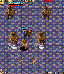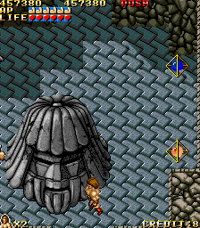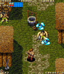 There’s not much context given when you start up UPL’s Vandyke – there’s a dragon on the title screen, and there’s a muscular barbarian, and the speakers roar like an elephant when you insert a credit. It’s an overhead action game, that would technically be classified as a “run and gun”, except without the gunning, since you’re restricted to melee weapons. In the pantheon of other similar games, it’s somewhere between Capcom’s Avengers and Namco’s Legend of Valkyrie.