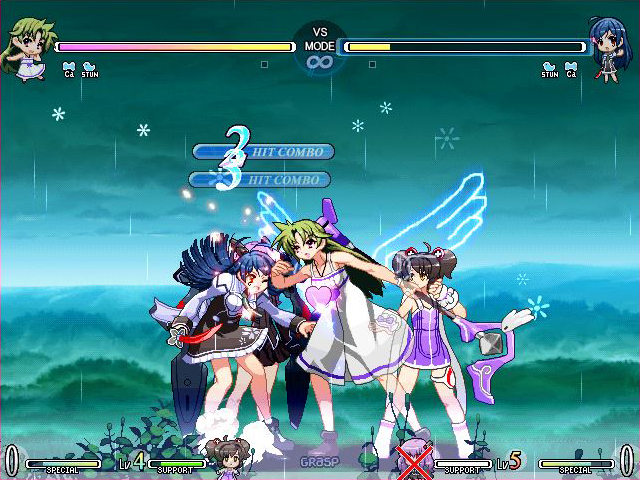 As you may have noticed, the game uses assist characters, not unlike Capcom’s older Vs games. The twist is that these characters follow you around on the field, so you have to watch where they are on the screen to know when best to use their skills. They also have multiple moves that change depending on what direction you’ve input along with the assist button. Each character fits the ladies of the main roster differently, and can significantly change strategies and options in a match. Sierra is good for projectile back-up, Eko is good with aggressive melee fighters, Juliet can punish and assist with combos, and Kanae creates useful traps. Hilda has a little of everyone’s style, making her the most well rounded over all, though surprisingly the least useful.