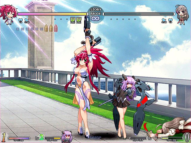 Luna Himeki – A former special forces soldier, Luna now works as a bounty hunter and is chasing after a big bounty. She has a weird gun-fu style heavy on stances and projectiles. She’s also the game’s fanservice character, going as far to only wear a heart pasty instead of panties. Really.