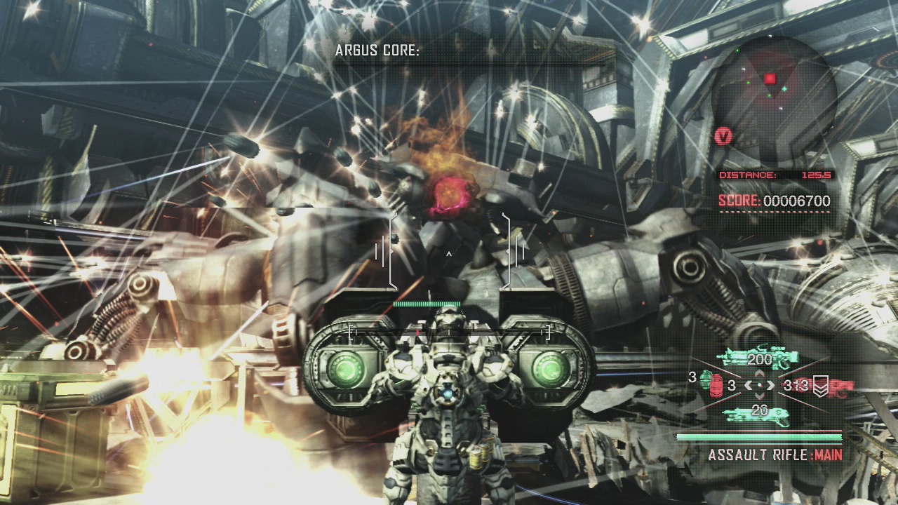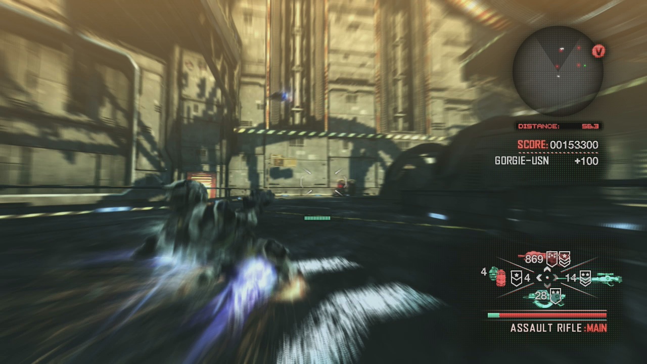 What’s important is that Vanquish functions as a reaction against this nascent ideology. It’s happy to borrow the disorienting spectacle a lot of these games were known for, but it never once thinks of pursuing their self-serious realism. Vanquish‘s logic is different from that: it sees the visual arts (animation in particular) not as a prompt to mirror a single idea of what’s real, but as an opportunity for creative expression. Hence it cuts anything it feels is unnecessary and exaggerates whatever features it happens to be interested in.The results of this approach should be plainly visible: where other games demanded that they be taken seriously with a rough, dirty art style, Vanquish aims for what it finds is aesthetically pleasing: smooth mechanical surfaces. Its greys are brighter and more colorful with subtle tints of blue, green, yellow, etc. Bullets visibly whiz through the air, and some of the boss battles climax with a Macross-esque spray of missiles. And from an animation perspective, movement feels bizarre. Characters in hulking armor traipse about the Providence with an unexpected quickness, their suits only weighing them down when you wouldn’t expect them to.