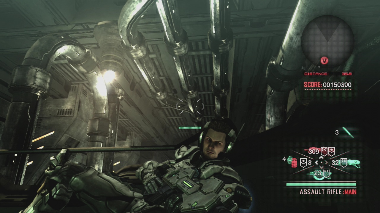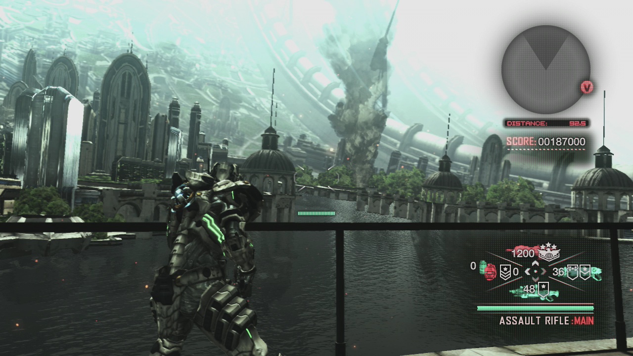 But it’s the way Sam upgrades his weapon that really demonstrates how Vanquish‘s brand of action differs from the crowd. The broad strokes are very similar to what other contemporary shooters were doing: not counting his grenades, Sam can only hold three weapons at a time, meaning he’ll often use whatever weapons the enemy’s using to ensure he doesn’t run out of ammo. Vanquish complicates this set-up with its upgrade system, where picking up a weapon when it already has full ammo will permanently upgrade that weapon. It might gain more firepower, it might reload more quickly, it might have a larger magazine, etc. This system allows Vanquish to achieve two things. First, by emphasizing the weapons beyond their immediate use, it becomes easier to appreciate all the little quirks in how they handle, giving those weapons a strong presence. Second, the system introduces a tension between short term and long term that enhances tactical thinking. Do you prioritize making Sam’s weapons more powerful in the long term by reserving one of his weapon slots for an upgrade-only weapon, or do you make full use of his arsenal for whatever conflict he’s currently embroiled in? Unfortunately, the scoring system isn’t as fortunate as either of these other two features. It lacks too much context to work like it does in many other action games (Metal Gear Rising, Devil May Cry, Bulletstorm, etc.)