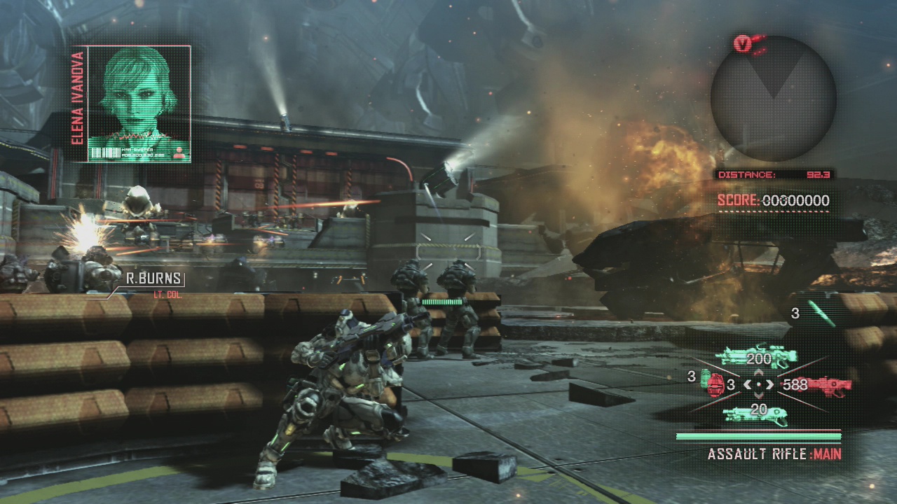 When the game begins, it’s clear that it’s trying to mimic something like Gears of War, but simultaneously, there’s a sense of style that seems uniquely Japanese (or at least, distinct enough from other American games). For starters, despite the heavy military technology and presence of large, stomping robots, it’s actually quite bright, to contrast the brown-and-grey color palette these games otherwise utilize. There’s also an intensity to the way that the battlefield is presented – bullets are presented as projectiles, rather than just using the invisible, hit-scan function. Missiles blast around in every direction with Itano Circus-like rocket trails. When the screen is littered with fire, friendly or otherwise, you don’t even need to be running and gunning to feel the exhilerations; merely existing in the game world is enough.