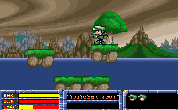 There’s only a single 1-up in the game that actually functions, since touching the other icons which look identical won’t actually do anything. Collision detection glitch, or cruel programmer humour? Also, each time you collect an item the main character says something inane, including complimenting the player on being Strong Gay! Presumably this is Engrish and was meant to say “strong guy.” Presumably.