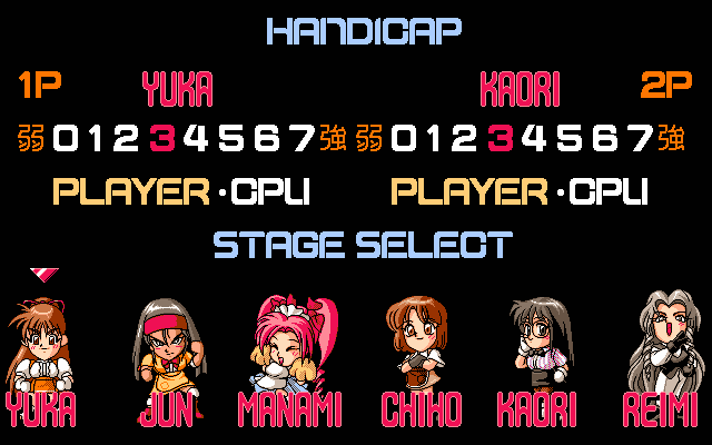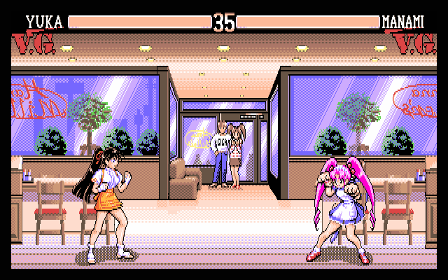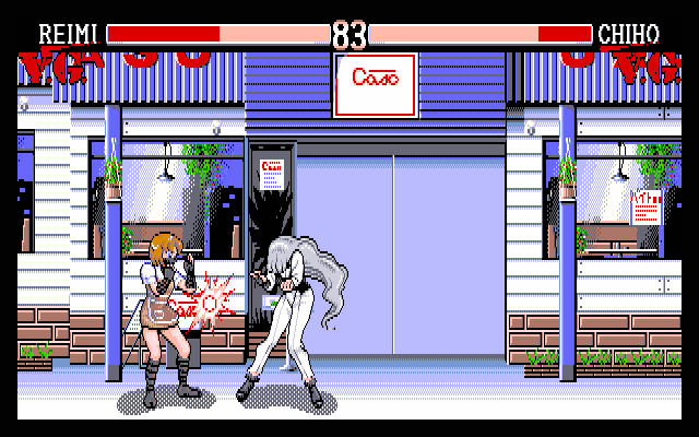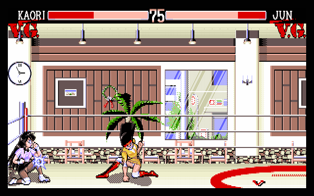 Gameplay-wise, V.G. is as straightforward as it gets. There’s a basic punch and kick attacks, with no distinction between heavy and light variety of these moves, because PC98 compatible controllers don’t have more than two action buttons. Each character has a set of unique techniques activated by specific button inputs. Most of them might resemble those from SF2 a lot, to the point that one can call some of them gender-bent expies of SF2 fighters.