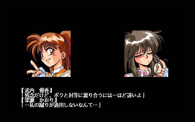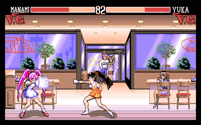 Just like many other PC98 titles, this game is quite the looker with all the dithering and other features characteristic of NEC’s platform. It also helps that characters were designed by the late Takahiro Kimura of Code Geass fame. Too bad this impression falls apart once the game properly starts. The scrolling is very choppy and so is the character movement. Coupled with unresponsive controls, it gives a very awful gameplay experience. The sprites themselves might bear some resemblance to Kimura’s artworks, but at the end of the day they look amateurish in comparison. The stage backgrounds aren’t really that much better. But hey! At least girls jiggle their chests and flash their underwear a lot. Which is not surprising, considering what kind of game V.G. really is. At least Takahiro Yonemura’s FM soundtrack does its job, but then again it’s ruined by very rough voice samples that can be switched off if someone finds these annoying.