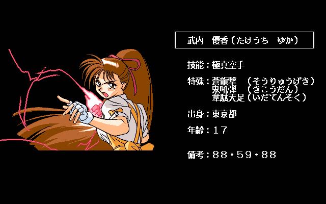 Yuka Takeuchi – The main character of the story. A waitress at Hanna Miller’s restaurant (based on the non-defunct Anna Miller’s chain), she’s also a practitioner of Kyokushin-style karate. Yuka entered the tournament solely to prove herself as a martial artist. She’s pretty much the game’s equivalent to SF2‘s Ryu, right down to her moveset. Voiced by Mika Moriwaki.