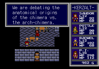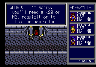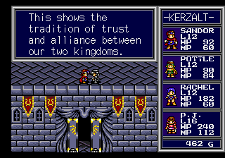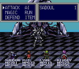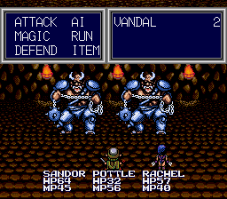 The characters themselves aren’t that interesting either, with only occasional glimpses of personality during cutscenes or the rare dialogue exchanges. Of course, since this is a Working Designs localization, the script is punched up with plenty of jokes and innuendos – every male character in the area makes note of Rachel’s sexy leather outfit while PJ silently notes how “equipped” Sandor is when meeting him. Nearly all of the main characters names have changed as well – Sandor’s Japanese name was Heibelger, which is a little difficult to pronounce, and the English text wouldn’t have fit in the interface boxes anyway.