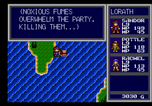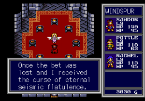 Adding humorous dialogue to give some flavor to an otherwise bland game became a Working Designs specialty, particularly with later titles like Albert Odyssey for the Saturn. But their propensity for juvenile gags reaches an apex with Sirufa, the wind fairy. In the Japanese version, she simply uses her powers to warp you to a new area. In the English version, she’s cursed with deadly flatulence, requiring that you buy and equip filtration masks on all of your party members. Otherwise, the smell will kill your party and you’ll need to reload the game. There’s also a joke chest in the original Japanese version that only gave you a single gold, which was changed to a “vortex chest” that sucks away your entire gold supply. How hilarious!