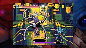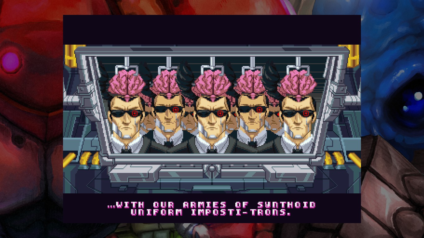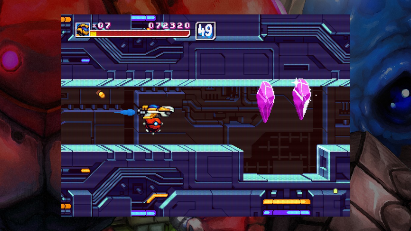 There are five stages (including an irradiated desert, a rain- and neon-soaked city and the alien overlord mothership), and they are fairly long, even more so if you manage to find the entrances to the secret areas. These areas hold 1-Ups and a secret item (one is found in a cell in stage 5 and you’ll have to fight a powerful enemy for it), and if you’re able to find all five of them in a single game, the “one-hit death” mode (for both players and enemies) will be unlocked in the options menu. Managing to find the secret areas is also important on higher difficulty levels, since they are stingy with curative items, and more foes also means racking up more lives by scoring points, provided you can survive. Another nice touch is how these areas will sometimes give a preview of enemies encountered only later in the game, like the psychic aliens hiding in stage 2’s secret cave.