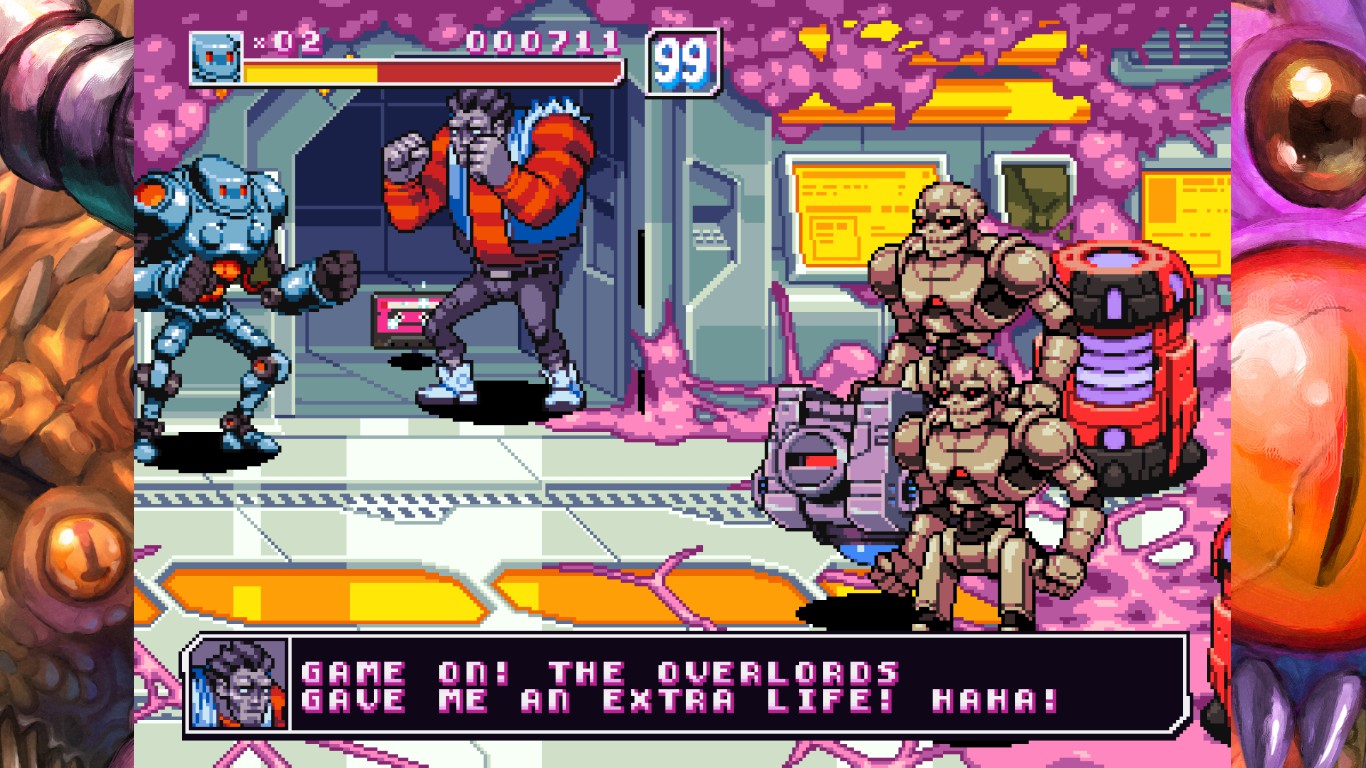 The story is narrated with cutscenes consisting of stills drawn in very detailed, comic book-style pixel art, and in general the in-game art style (still respecting the hardware’s limitations: 16 on-screen colors, the original resolution, 4:3 screen proportions and number of sprites the system can handle) reminds of comic books, 1990s cartoons and the arcade titles the game homages, and not just other Neo Geo games like Mutation Nation. The concept of a man, a woman and a non-human against hordes of freaks recalls Sega’s Alien Storm, some of the areas like the first stage’s swamp remind of Cadillacs and Dinosaurs (and the Cadillac itself makes a cameo later), and the stage progression towards sci-fi (with the appearance of Men in Black-style agents and Terminator-looking skeletal robots among the enemies) up to an outer space finale is similar to Captain Commando. The homages also extend to other parts of the gameplay, since one of the bosses, the “Quarter Jockey”, is an arcade game fanatic who is seen playing a cabinet and attacks us with several moves coming from popular brawlers and fighting games. It’s probably no coincidence that he’s one of the toughest boss fights despite not being a robot or mutant weirdo.