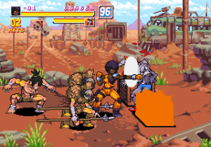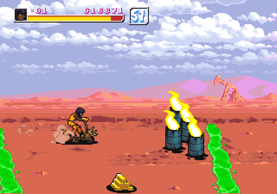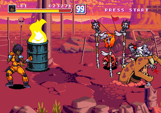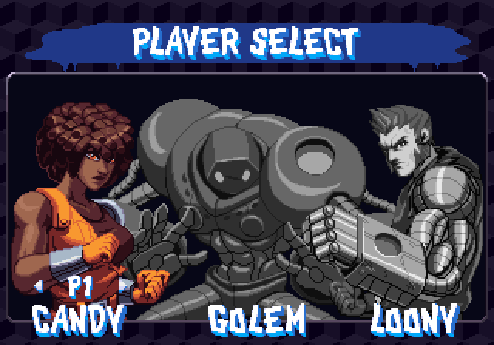 Golem, Loony and Candy also do not precisely fall into the usual “tough but slow/average/fast but frail” triad that was everywhere in 1990s beat-em-ups, but play differently from one another, giving even more depth to the combat system. Golem is the grappler who possesses a number of throws and is good at crowd control, Candy is all about evading and chaining combos, plus she can cause damage over time by making enemies bleed with her blades, and Loony keeps enemies at bay with ranged attacks, by shooting missiles from his arm (he was originally supposed to stretch his arm a la Dhalsim, but the Neo Geo hardware can’t handle too many sprites on a line), bouncing baddies all over the place.