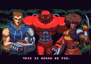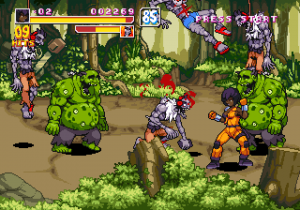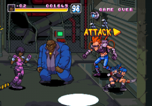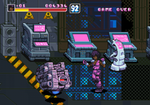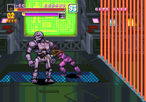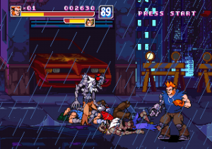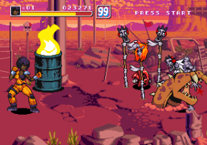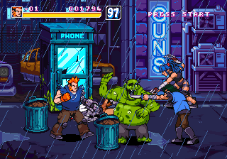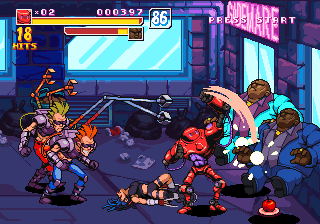 There are also two other differences from typical beat-em-ups: the desperation moves give a risk/reward element, in that the amount of lifebar consumed by them will be greyed out, and you can recover it by hitting enemies, being careful not to get hit in return, or you will lose all of it in one time. Another is the absence of the standard brawler melee weapons, replaced by a number of floating sci-fi firearms ranging from machine guns to missile launchers and flamethrowers, with limited ammo but that cannot be lost once picked up.