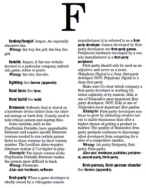 All the doubts about the book's integrity aside, the most important question remains: Is it useful for my publication/website/blog? It is, at least by saving the first steps to what can eventually become a complete compendium of important terms with your own additions and alterations appended to it. Will it move game journalism to the next level? Aside from actively trying to worsen the confusion about "video games" and "videogames" by promoting the separatist spelling that should really be eliminated, it actually might if it can bring everyone to care about consistency within their own editorial body.