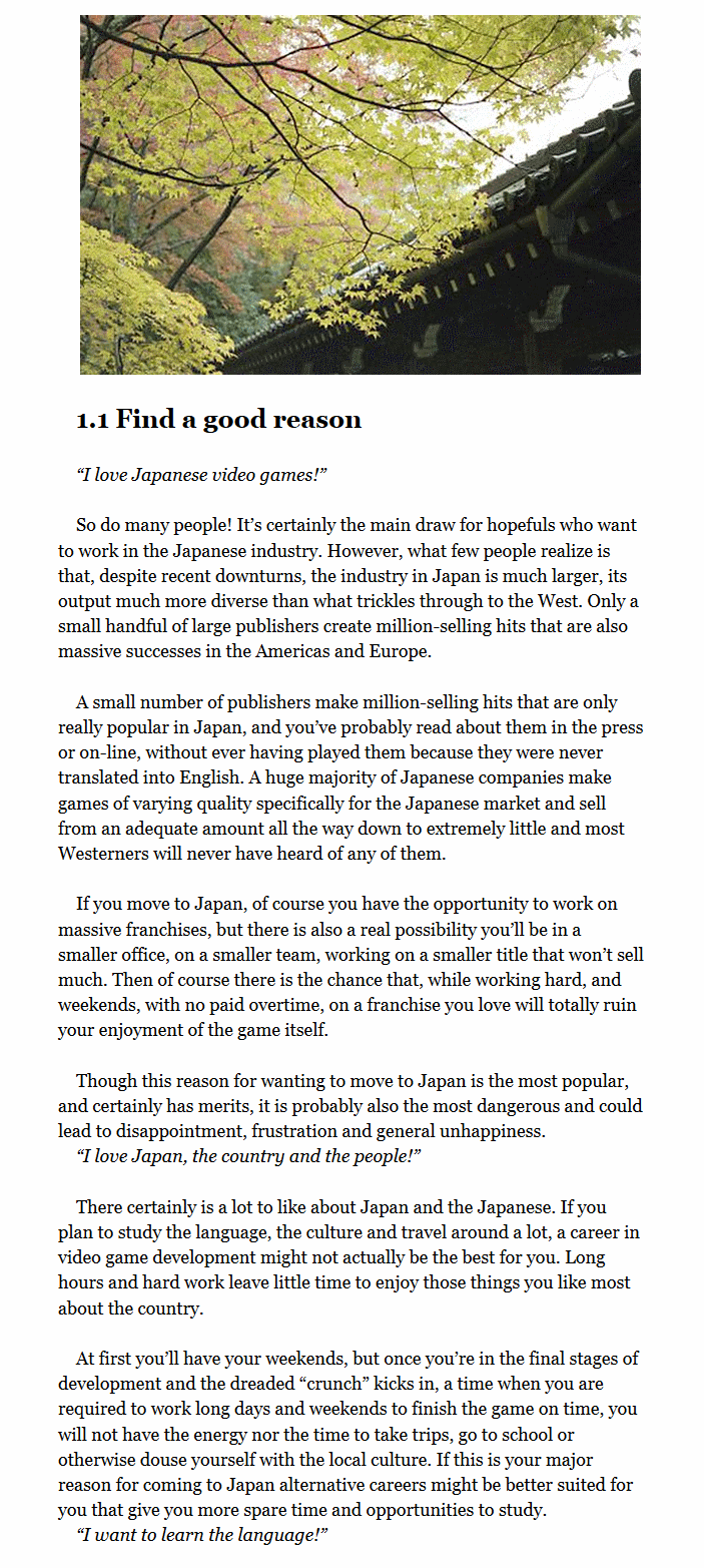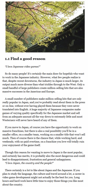 Not being in that category of reader or potential expatriate, it's impossible to judge the book on its intended purpose. Certainly it seems comprehensive, detailing reasons for making the jump, learning the language, getting a degree and experience, choosing a career path, available jobs, writing a resume (in Japanese), creating a portfolio, interviews, tests and visa applications (in Japanese), types of employment contract, corporate culture (and differences), daily routines, renting a flat, bank accounts, various laws, and much else. This is followed up by a series of reprinted editorials from the Japanmanship blog, interviews with non-Japanese developers living in Japan (at companies like Square-Enix and Grasshopper), and over 250 listings for games companies in Japan with contact details.