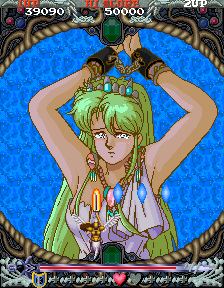 When this girl is attached on the beach by an enormous grab, it uses the famous “WARNING! A huge battle ___ is approaching fast!” from Taito’s Darius shoot-em-up series.