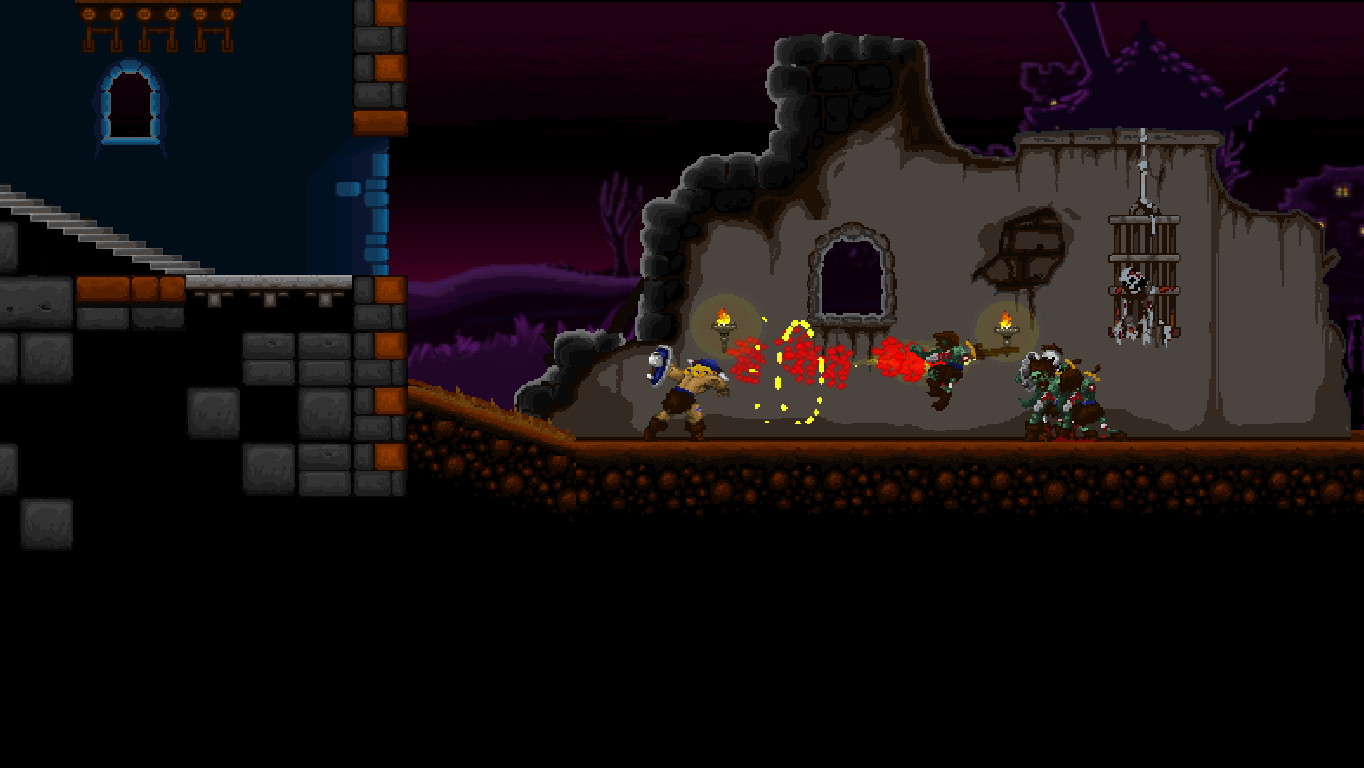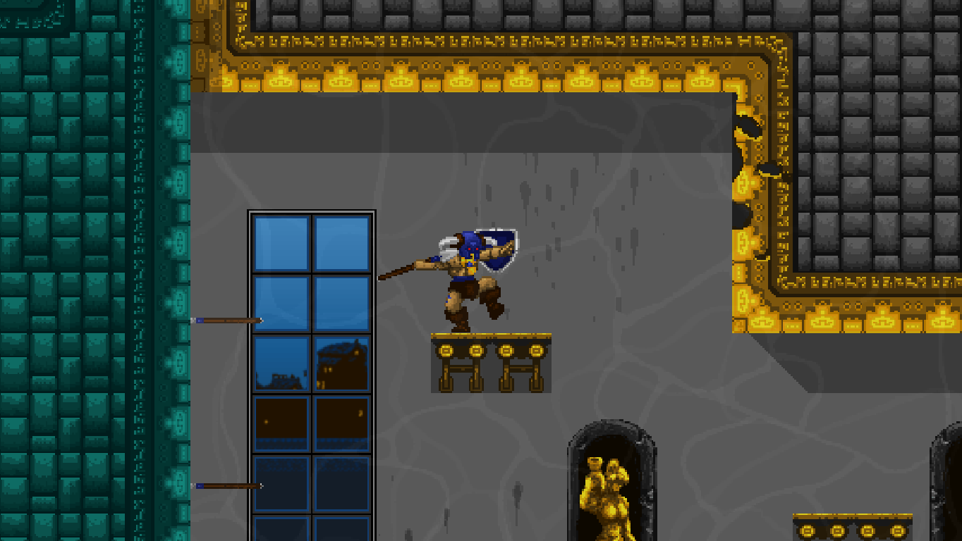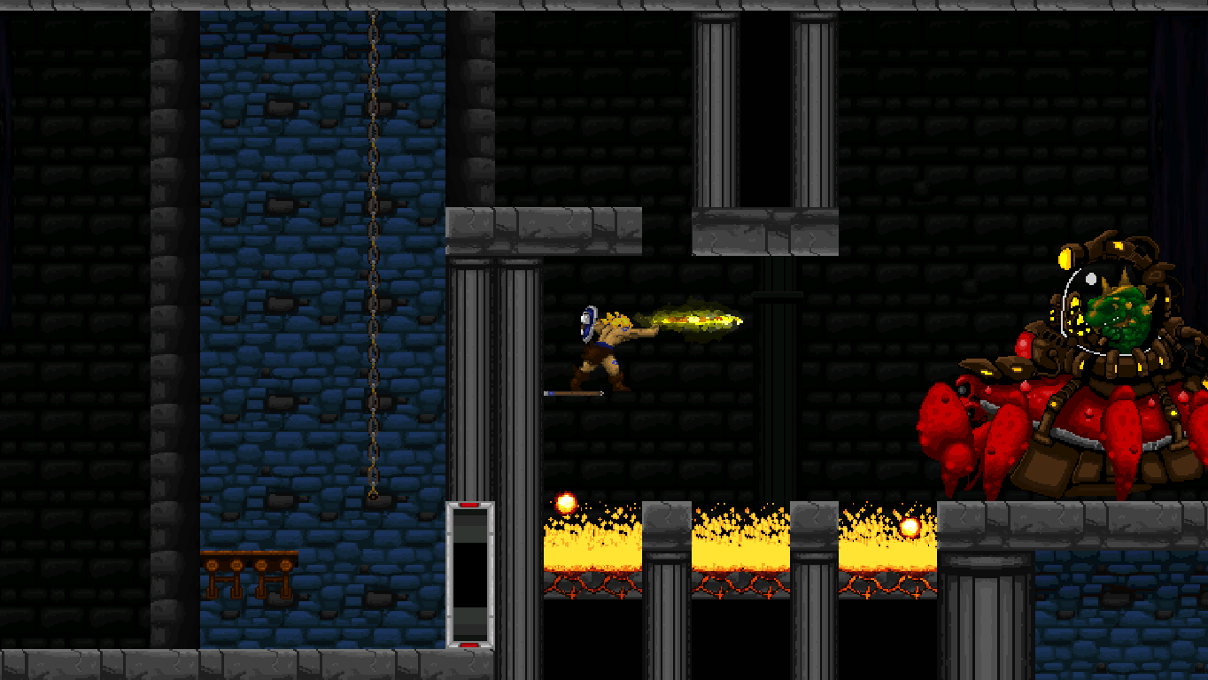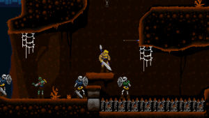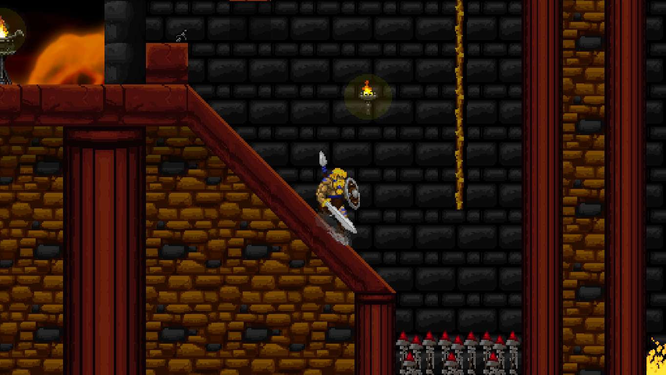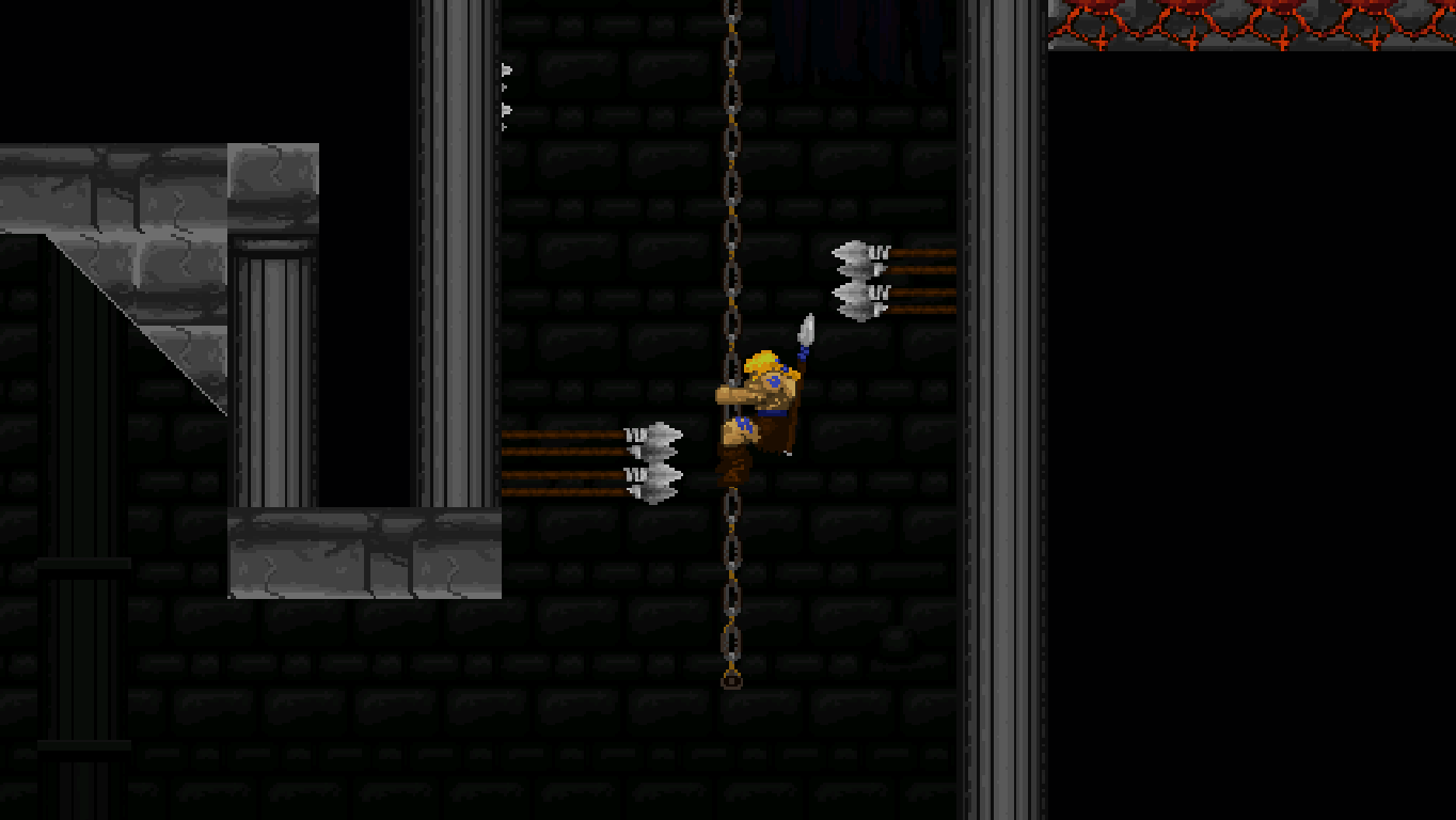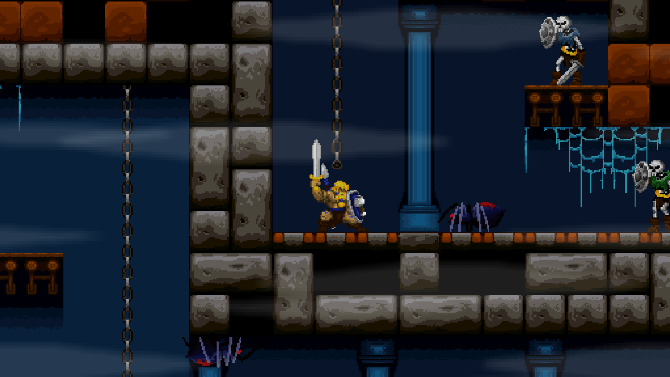 Climbing ropes and sliding down slopes also works similar to Rastan. The game features a double jump, but compared to many other modern games, the stiff jumping mechanics ensure that it has a purpose and is not just a fancy replacement for a single long jump. Only Völgarr’s evasive roll seems a bit more modern than the rest, but given how greatly it expands the range of possible combinations, it’s well worth the small clash in style. Even more satisfying is the ability to create platforms (and sometimes shelter) by throwing spears at walls, adding a subtle sense of interactivity that many of the old games lacked.