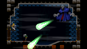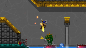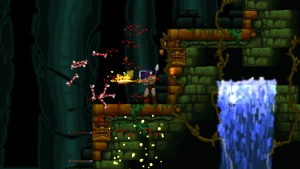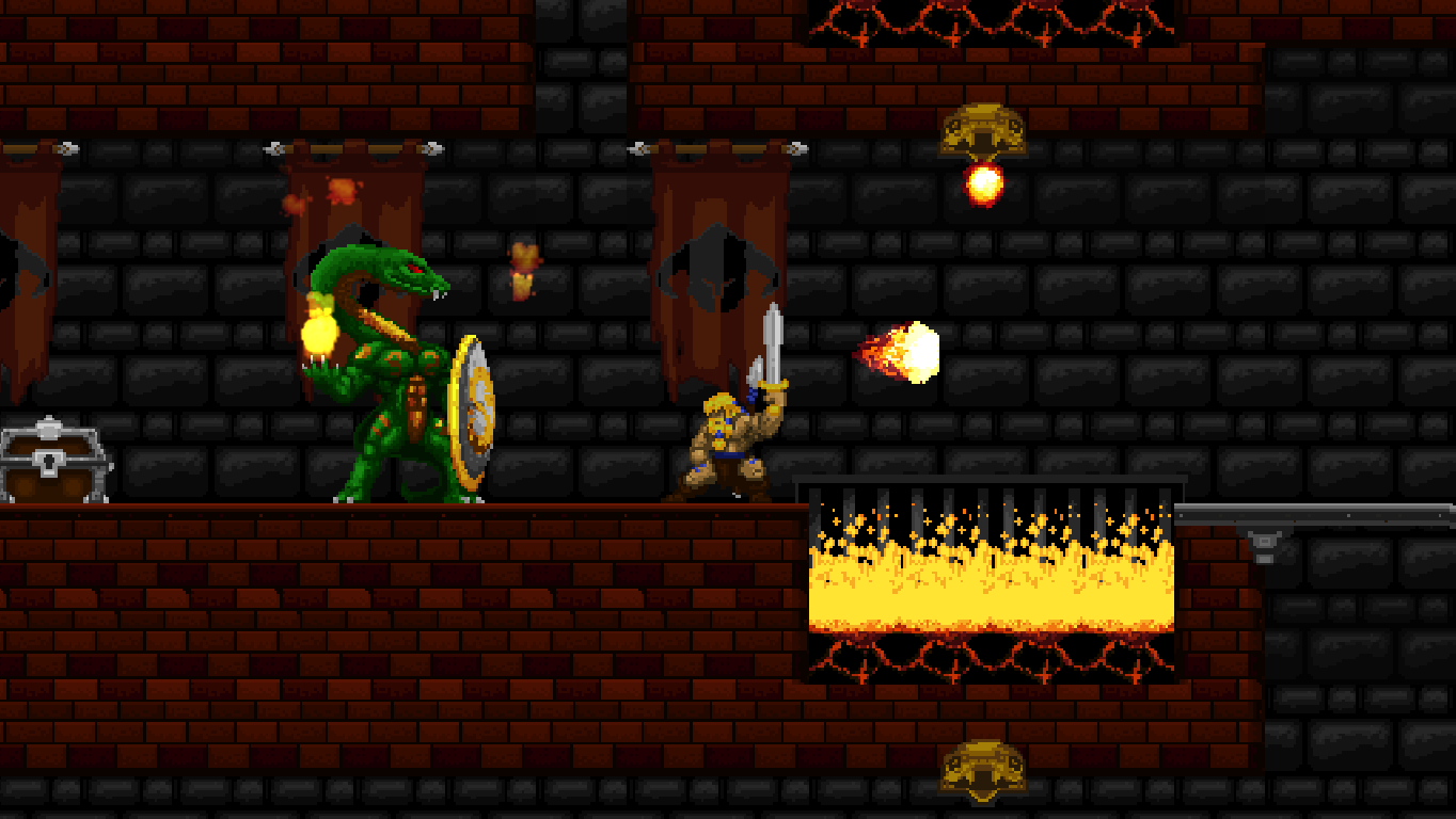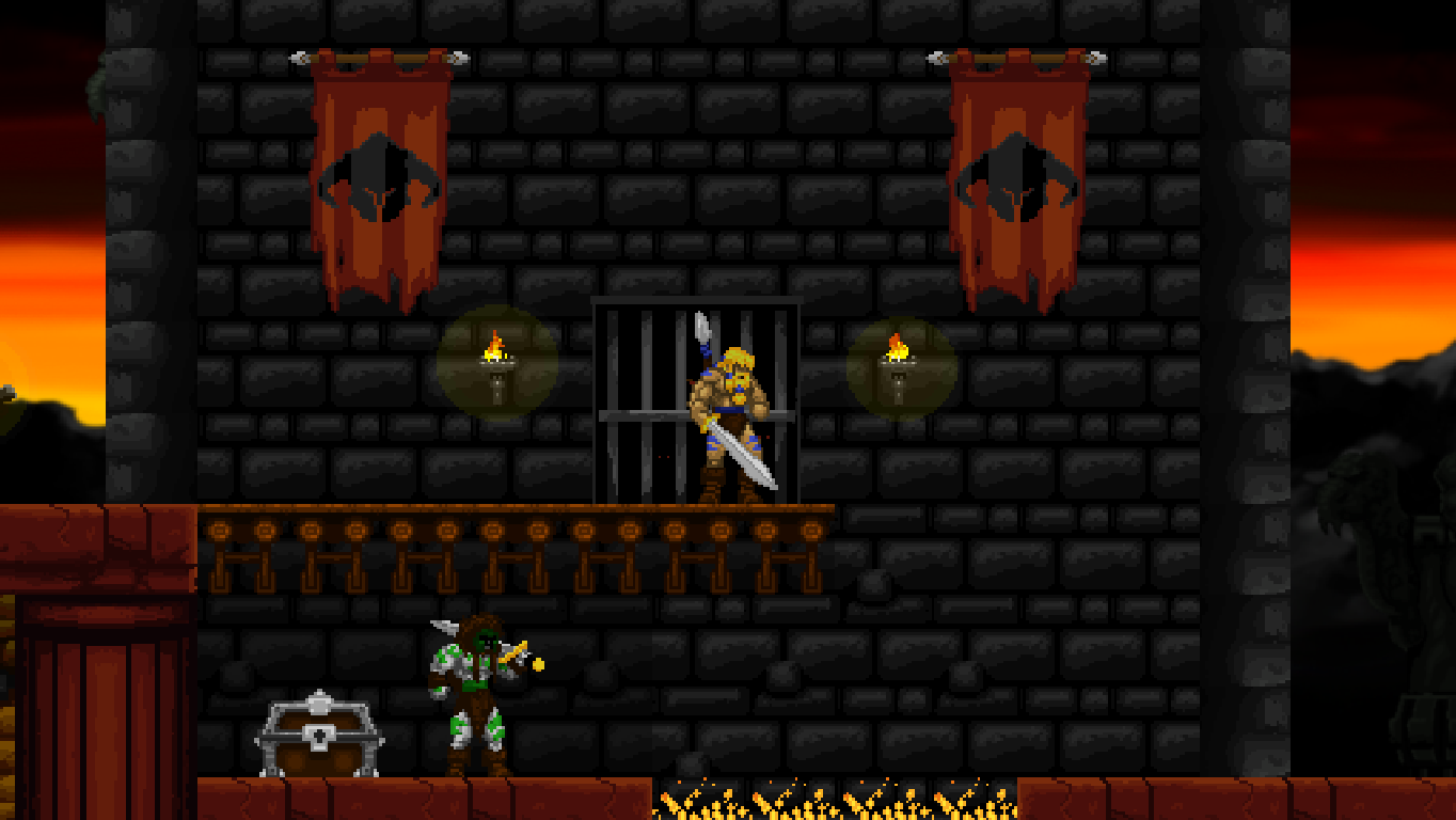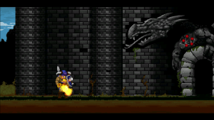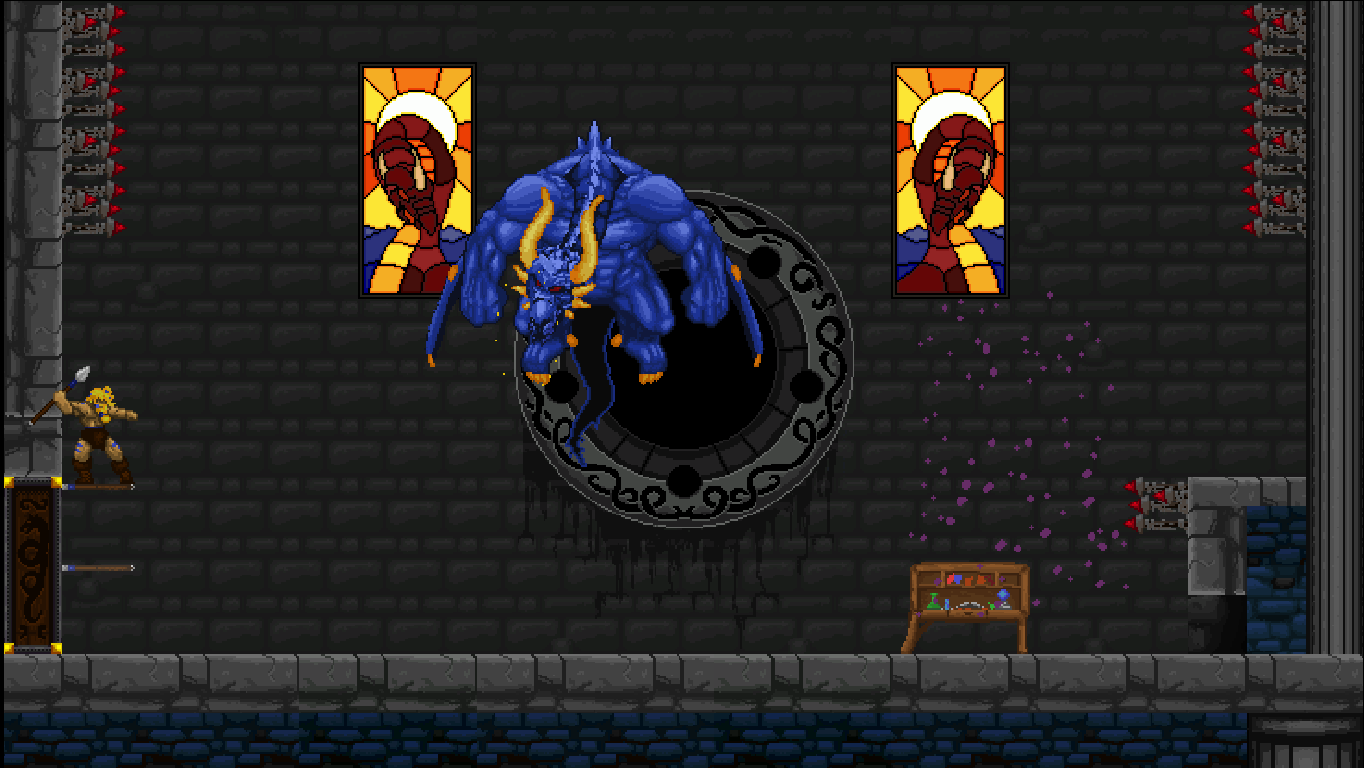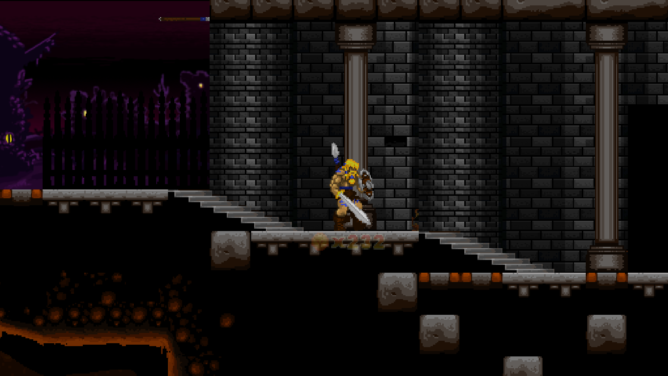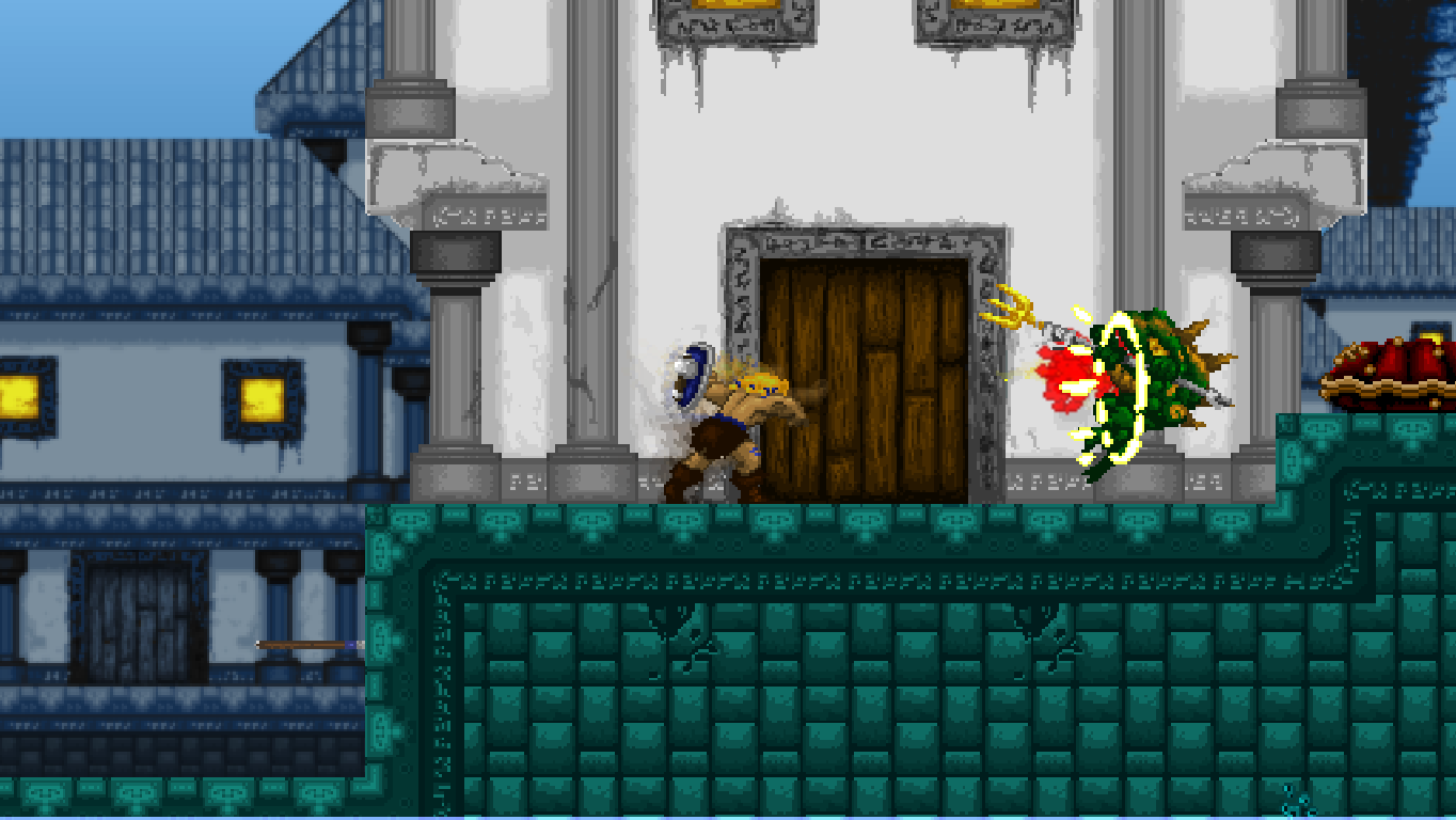 Accordingly, Völgarr stays closer to his roots than the time traveling ninja. The Viking’s combat maneuvers are limited to an ordinary slash, a downward attack from mid-air, a rotating double jump attack and an endless supply of throwing spears. The game excels through mechanical efficiency rather than flashy combos and acrobatic juggling. Success and failure depend entirely on the player’s mastery of Völgarr’s moves, their range, time frame and peculiarities. So slashing with the sword allows him to walk backwards for a brief moment: an ocean of possibilities if applied adequately, a frustrating deathtrap for the less agile. Jumps have a fixed trajectory familiar from classic Ghouls ‘n Ghosts or Castlevania, but like in Rastan, pressing the opposite direction allows to slash backwards while in the air. It is this profound understanding of what made the classics feel so tight, so fast, and so satisfying, that makes the game seem more genuine than any other attempt at recreating the magic of the old days.