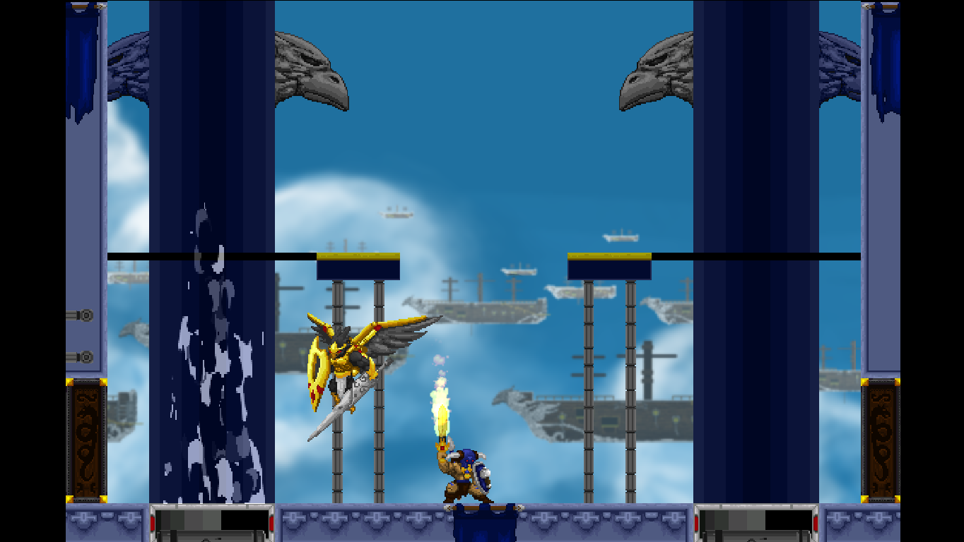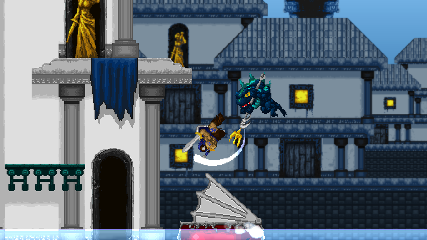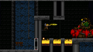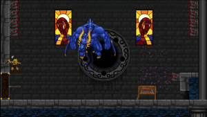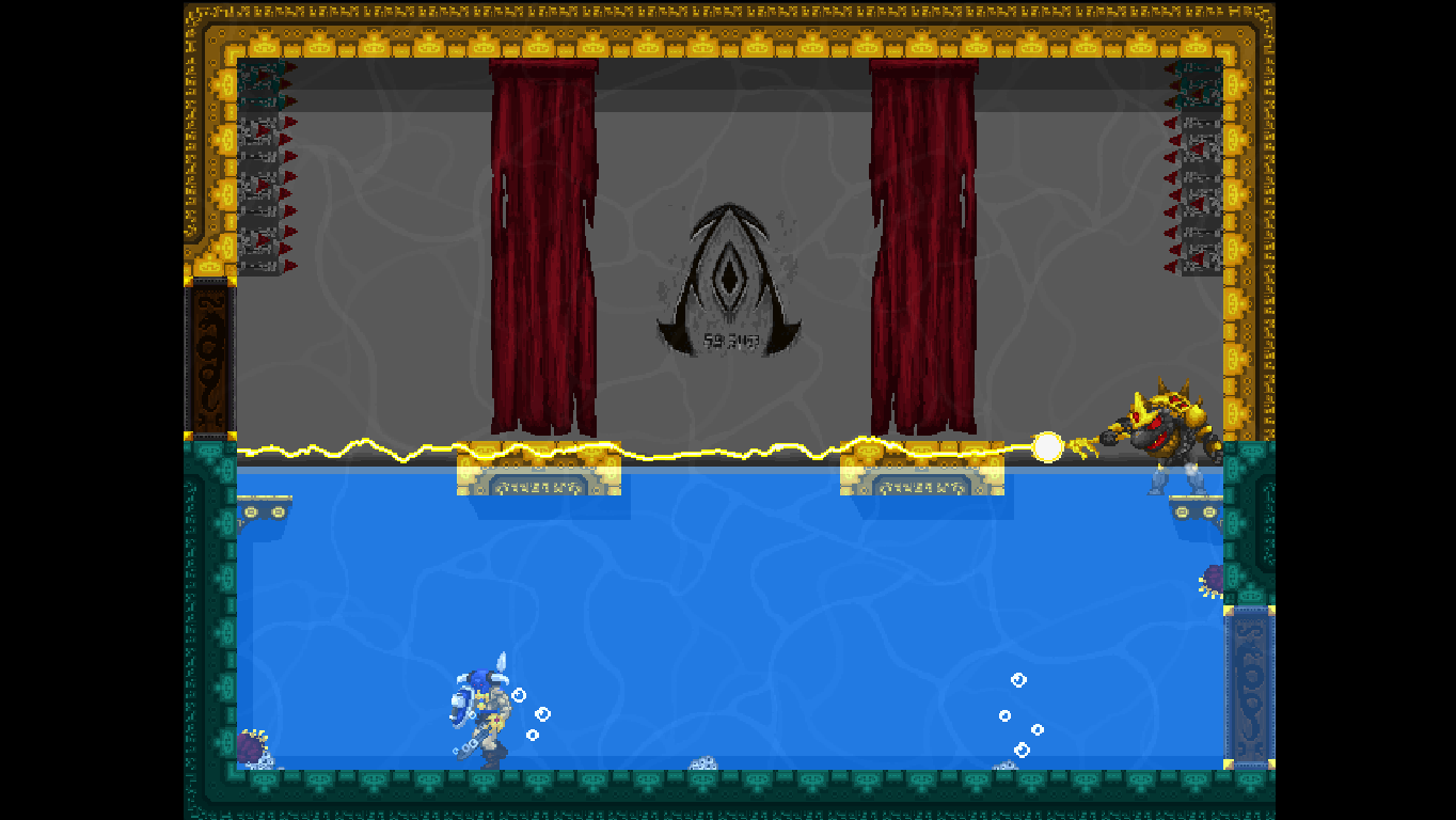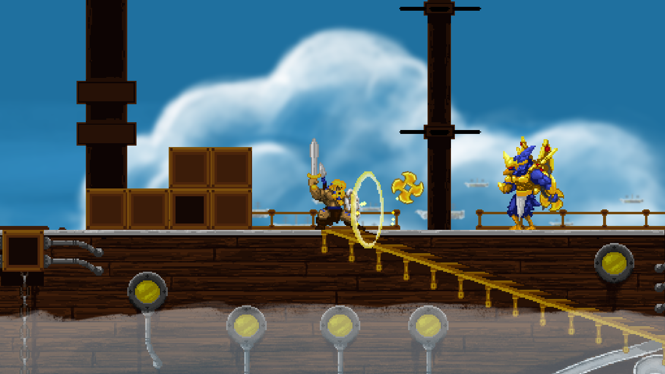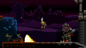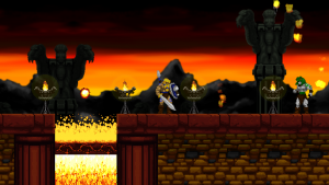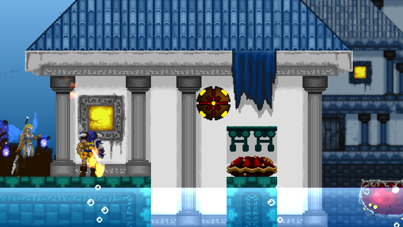 Accordingly, Völgarr stays closer to his roots than the time traveling ninja. The Viking’s combat maneuvers are limited to an ordinary slash, a downward attack from mid-air, a rotating double jump attack and an endless supply of throwing spears. The game excels through mechanical efficiency rather than flashy combos and acrobatic juggling. Success and failure depend entirely on the player’s mastery of Völgarr’s moves, their range, time frame and peculiarities. So slashing with the sword allows him to walk backwards for a brief moment: an ocean of possibilities if applied adequately, a frustrating deathtrap for the less agile. Jumps have a fixed trajectory familiar from classic Ghouls ‘n Ghosts or Castlevania, but like in Rastan, pressing the opposite direction allows to slash backwards while in the air. It is this profound understanding of what made the classics feel so tight, so fast, and so satisfying, that makes the game seem more genuine than any other attempt at recreating the magic of the old days.