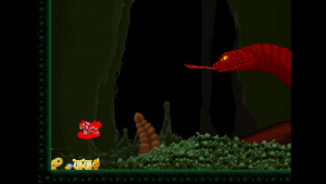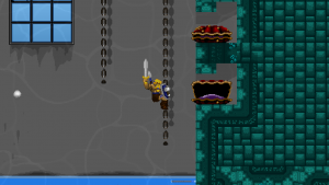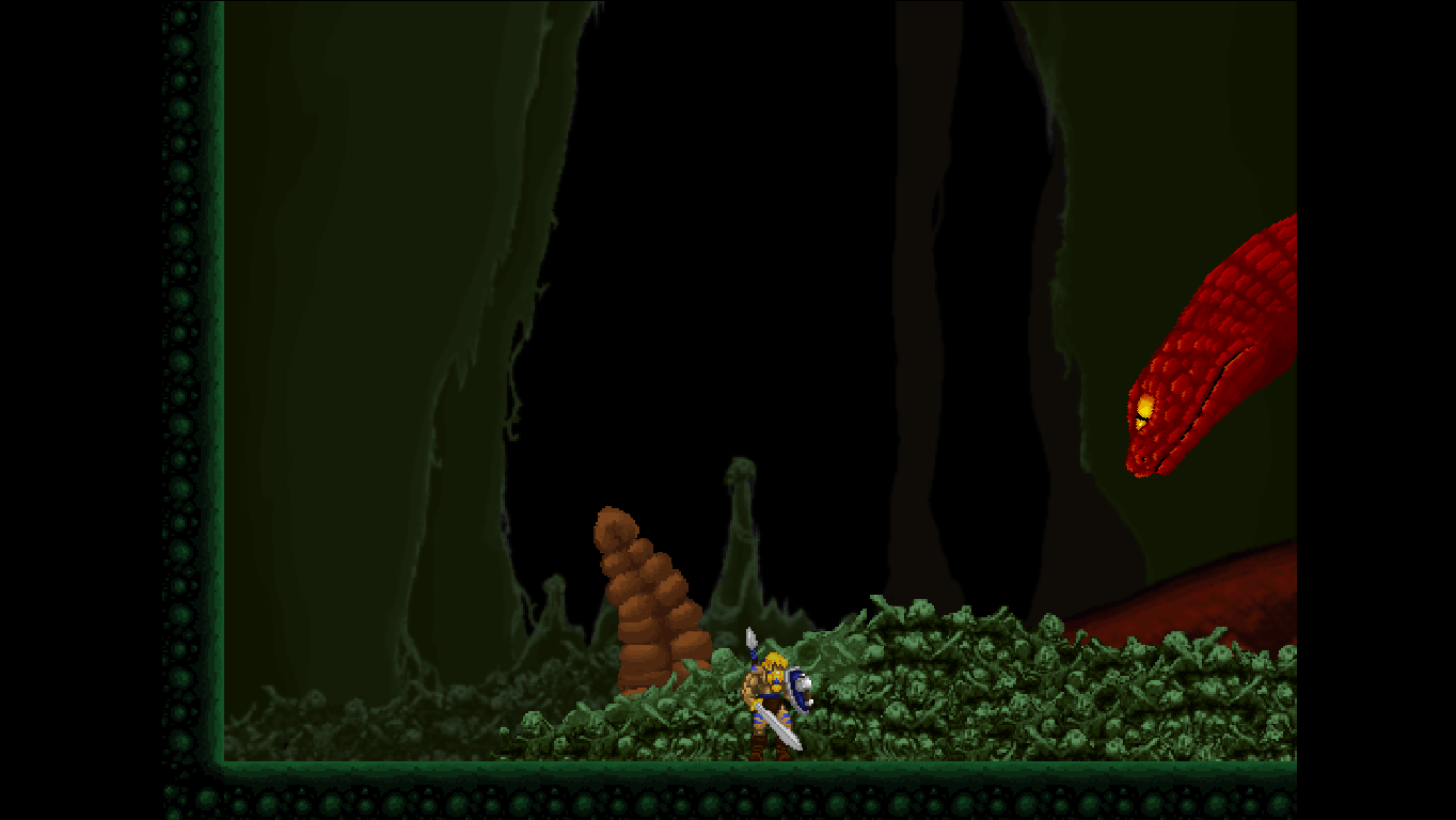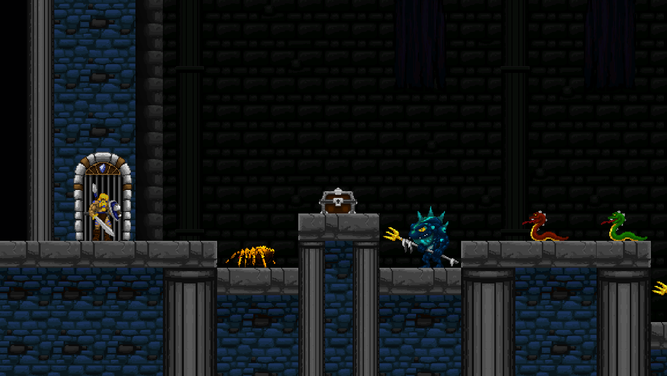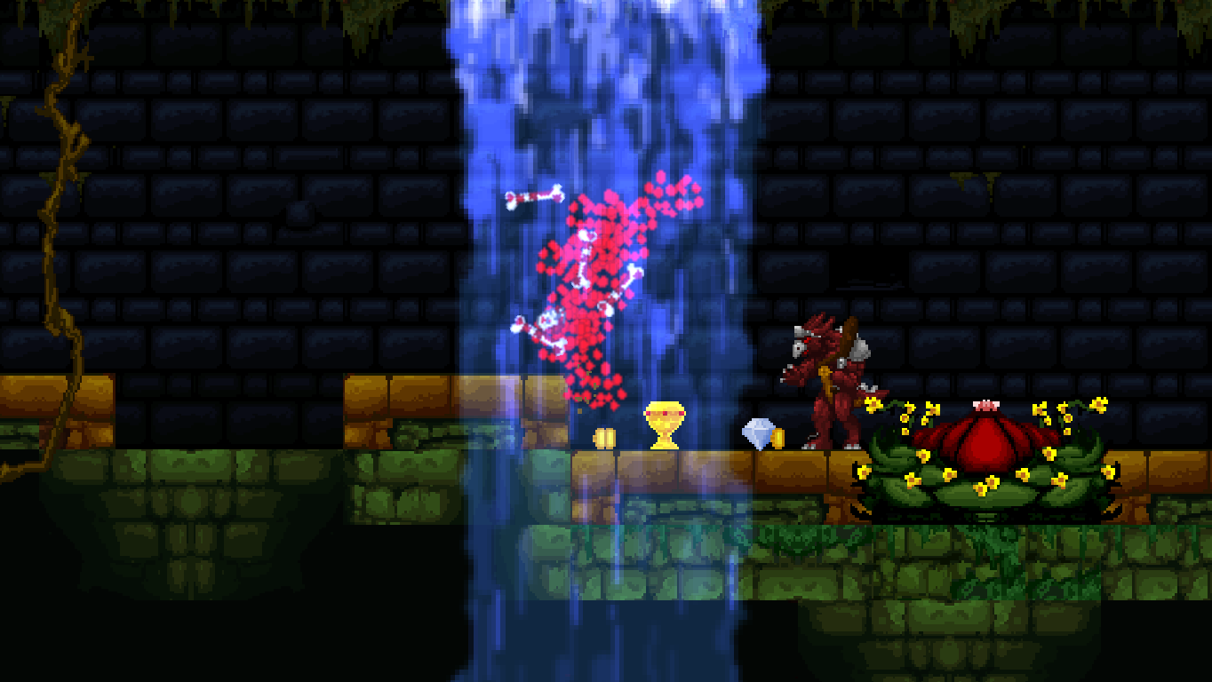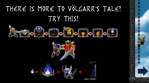The distribution of power-up containers is fair, but hardly enough to give you the upper hand in what might first appear as a hopeless fight. Enemies are very deadly until you figured out their movement patterns, and encountering a new enemy type often results in death. The game’s focus leans more towards varied repetition of known elements, though, so it’s more a test of agility rather than a memorization game. At certain points, most will need a few tries to get through a particularly vicious combination of enemies, which often complement each other to break the player. The second world, for example, features three types of humanoid toads: The green ones have a rather wide range with their tridents, so they have to be attacked from afar. Then they team up with their blue brethren, who always make a huge leap forward just the moment Völgarr throws his spear. The red ones, finally, dive down below the projectiles. Now this may sound simple on paper, but as soon as all three types attack at once (and together with more different enemy types), they quickly become much harder to manage. Also, don’t be intimidated by the lack of any apparent function to save your progress: By going left at the beginning of each world, those who have been beaten at least once can be easily skipped.
