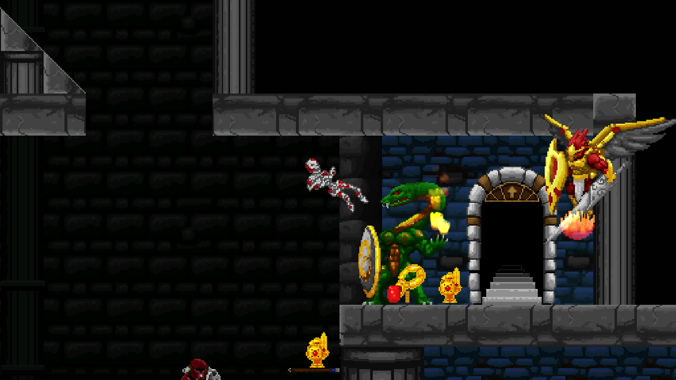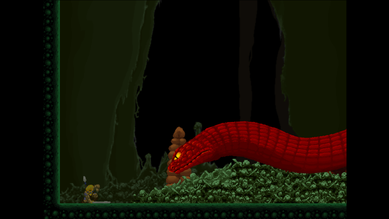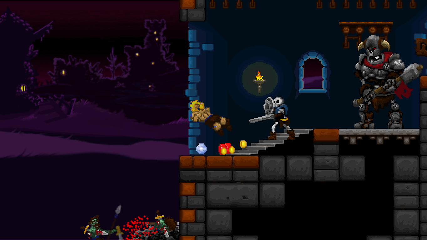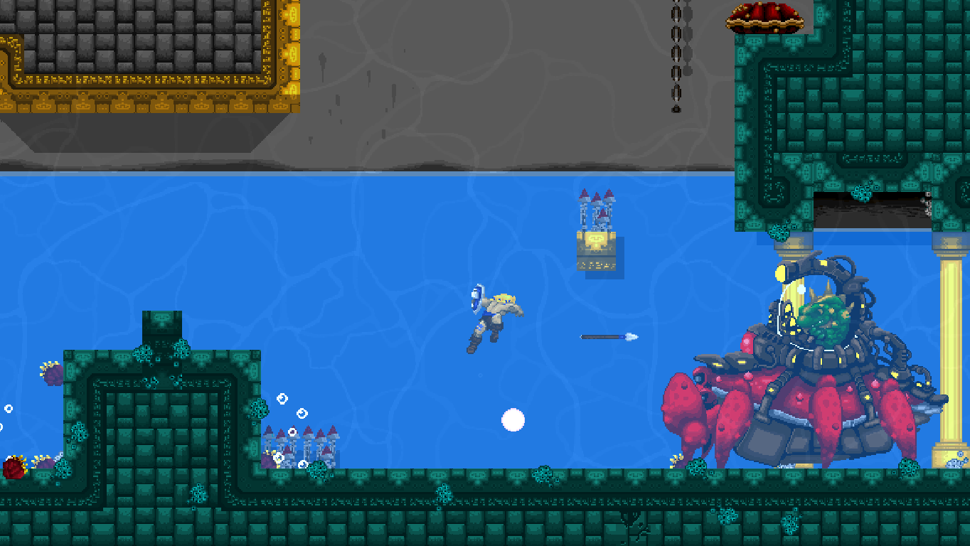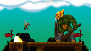 After that, the bosses aren’t all that difficult. Each one has a very simple strategy that just needs figuring out. The enormous lizard at the end of the first world, for example, carries a wooden shield perfectly suited to stick in spears as stepping stones to reach its head – and never linger on too much within its range. Two thirds of the bosses are impressive monstrosities worthy of the name. The rest is a bit disappointing as palette swaps of regular enemies, but what they lack in size they make up for with agility. Then again even some of the mooks are almost screen-filling.