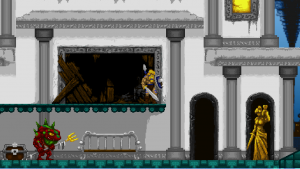 Another factor that sets Völgarr the Viking apart from its platforming role models is the high degree of graphic violence, which is more akin to something like Golden Axe. Enemies don’t simply explode or disappear like they used to do in 8-bit times, but burst into a gory mess of blood and bones. The same happens to Völgarr, who is resurrected by Odin from skeleton form at the beginning of each game, subtly implying that each attempt at beating the game is in the same continuity, an endless history of gruesome deaths.
