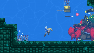 All that wouldn’t be much of an obstacle, if it weren’t for the game denying comforting features such as quick saves and frequent check points. Each world is divided into two rather large sections, but that transition is the only restart point. Only the final(?) stage is broken up into much smaller segments. To the experienced player a stage doesn’t take more than five minutes, but in the beginning this can be very daunting. It really isn’t as annoying as it sounds, though, with one exception: The no checkpoints policy also applies to boss fights, so if you just got there by the skin of your teeth and are obliterated immediately, prepare for going through a 5-minute stage again for every single try to learn the boss’ pattern.