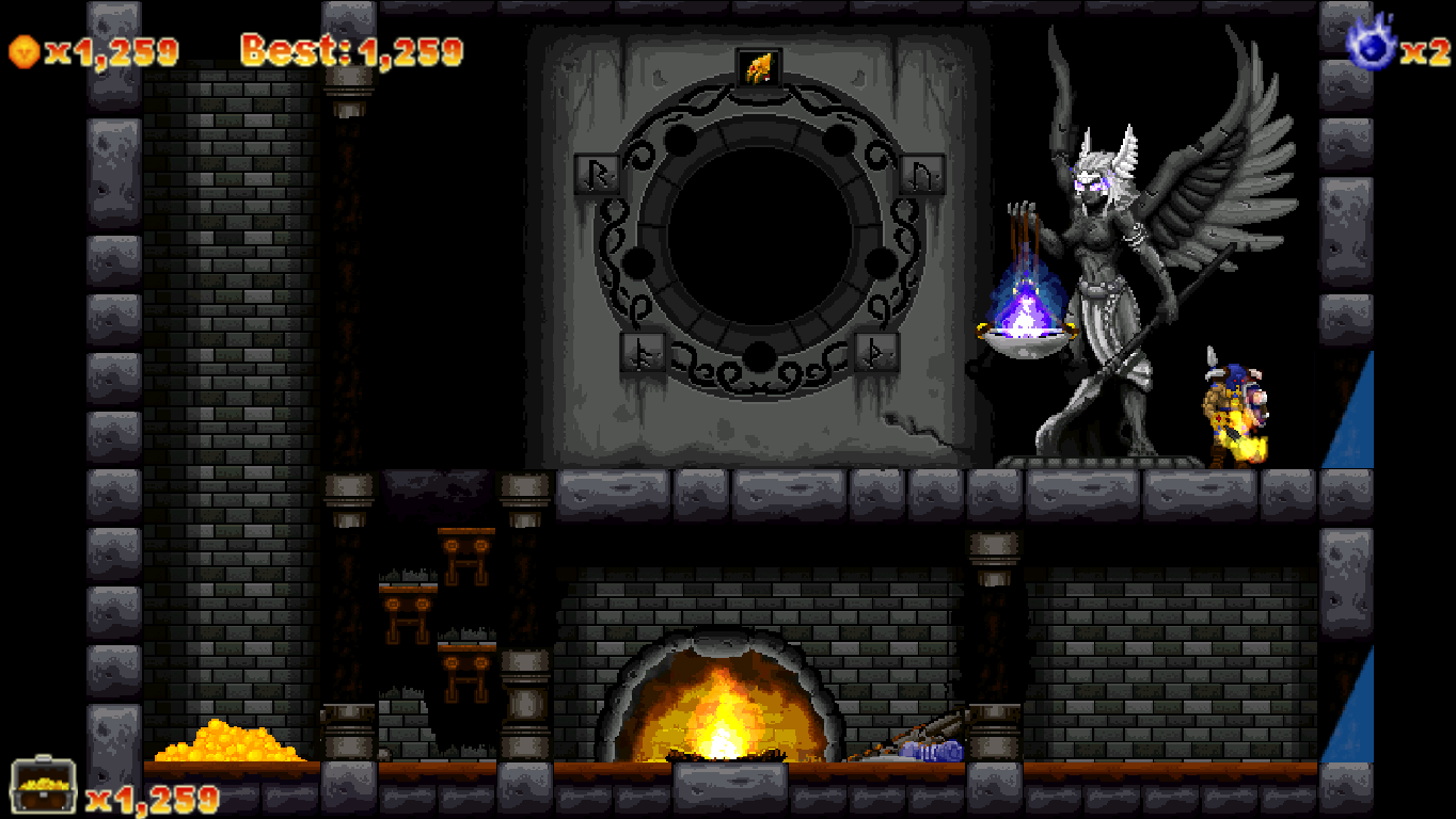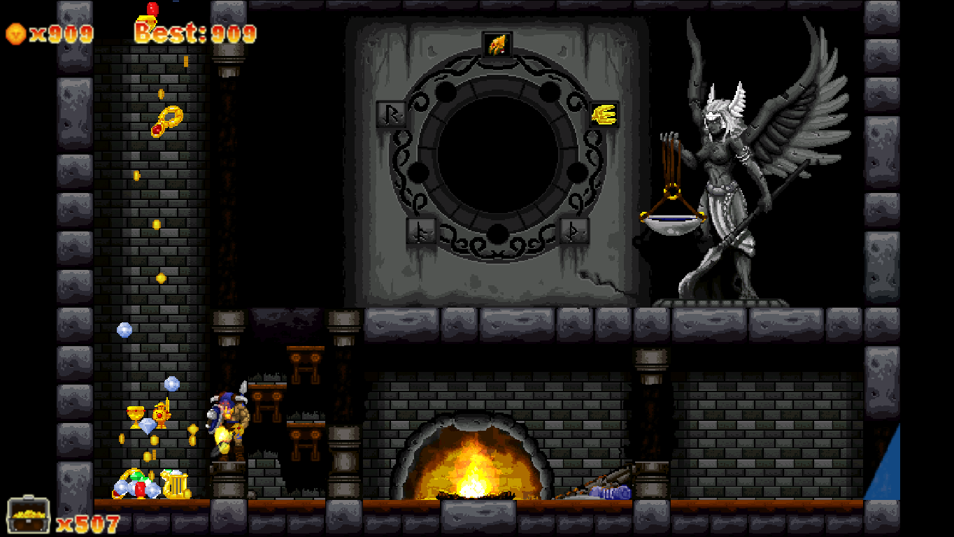 With only six worlds, a speedrun through Völgarr the Viking is rather short, but it will take a while to get to that skill level. As soon as you start getting flawless runs through the stages, though, you’ll discover that the game is actually much larger: When opening more chests with a fully upgraded Viking, the rewards will become ever more valuable loot, until a Warrior Spirit is set free, which makes a Valkyrie appear, who takes Völgarr to an alternate area of the next world. While the regular game allows for unlimited tries, here you’re strictly limited by the amount of previously collected Warrior Spirits, and losing them all drops you back to the normal route – after which you’ll have to replay the entire previous world for another shot at it. At this point it’s already beyond “well worth your money”-territory, though.