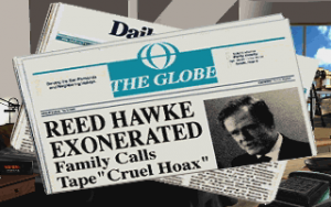 The writing and acting is, of course, hammy, melodramatic, and absurd. You know Hawke’s sister is awful because she’s snooty and racist (and also maybe sexually attracted to him?)! You know Reed’s son is angry at him because he shouts straight at the sky! You know his niece is crazy because she has a leather fetish and is bicurious! The best scene of the game is when her “friend”, who is wearing nothing but underwear and a “Hey! I’m a lesbian!” plaid flannel shirt, almost convinces her to experiment. Much of the humor revolves around Reed’s kinky, role play-loving, sultry lingerie-wearing secretary, which you see played out in the very first scene of the game.