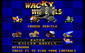 Of course, there’s no denying that most people played Mario Kart for the multiplayer, and Wacky Wheels does a nice job of bringing that experience to the PC. You can have a single race, either with the AI driving against you and your opponent or just head to head. Or you can get into a ‘Shoot Out’, which is basically the Battle Mode from Mario Kart. Two players drive around a small arena, blasting at each other with weapons found on the track until somebody scores a certain number of points. Of course, if you load up the game to play with a friend, you’ll want to make sure you have a decent gamepad that DOSBox will accept so that you don’t end up crowding the keyboard.