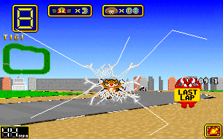 What’s odd about this game compared to other kart racers, however, is that there’s a way to lose a race before it even finishes. If you hit a solid obstacle while going too fast, your animal will fly out of the cart and hit the screen, cracking the monitor. This does take away one of your three lives, so you’ll want to avoid having this happen if possible.