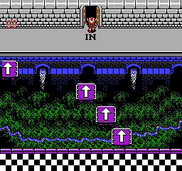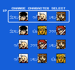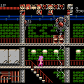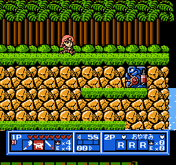 Goemon, Simon Belmont, and Fūma return from the first game along with two new fighters: Baby Upa from Bio Miracle Bokutte Upa and commando Bill Rizer from Contra. Upa’s game of origin never made it to American shores until 2008 on the Wii Virtual Console, but it is a creative platformer in which Upa must bonk enemies with his magic rattle to inflate and ride them upwards like balloons. Bill is definitely more recognizable, from the popular high-action run-and-gun Contra series. You are primarily in control of Rikkuru, who trots at a decent pace and attacks with a quick crescent projectile that travels through about a quarter of the screen. It is not a powerful attack, but it beats out Konami Man and Konami Lady’s punches and kicks. Rikkuru does have the added advantage of a double jump, good for avoiding pits and enemy fire. He can also take eight hearts’ worth of hits before he loses a life, and there are medkits to heal him. However, you will likely not be Rikkuru for too long once you pick up a C icon (provided by floating containers akin to Contra), as this causes the three character icons to flash red one by one.