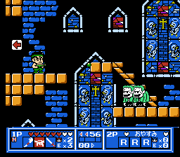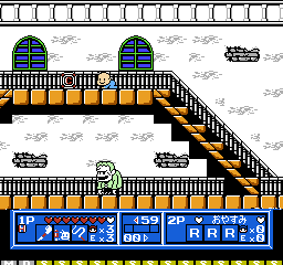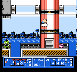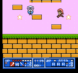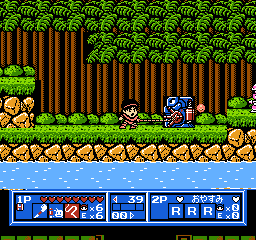 Like the first Wai Wai World, jumping while holding Up will transform you into whatever character icon is currently highlighted. You remain in that form for sixty seconds, during which you are technically invincible, as each hit just takes five seconds away from the clock instead of hearts. You morph back into Rikkuru when time runs out, though medkits can boost the timer and picking up another C icon allows you to re-morph into your current character or choose a new one. Unlike the first game, it is not crucial to pick any specific character for unique situations; everyone has advantages and disadvantages, but they are all essentially power-ups who exist to do more damage than Rikkuru and take punishment in his stead. Goemon tosses pipes which boomerang back to him about one-third across the screen, Simon’s iconic whip does good damage but is a bit slow, Fuuma’s sword is strong but has short range, Upa’s rattle is quick and turns enemies into platform clouds, and Bill fires quick bullets full range across the screen.