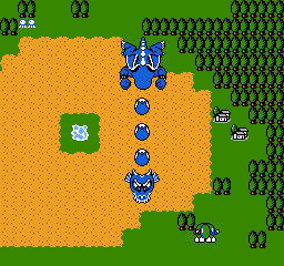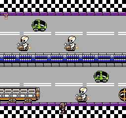 The remaining three levels, announced by Konami Man and Konami Lady, switch up the gameplay style. The third level is an overhead shooter where you pilot the TwinBee. You get to select between two different levels, and this segment actually plays faithfully like the original TwinBee before switching to a Space Harrier-esque bonus stage where you have to collect as many bells as possible. The sixth stage is particularly bizarre, as it offers a choice between two completely different genres. The first choice faces you off against three sliding puzzles where you have to form the full image while also keeping Konami Lady protected from a rogue train at the bottom of the screen. The second selection is an overhead racing segment, which is based on the (best forgotten) racer Road Fighter. Finally, the eighth level has you pick one of two levels to pilot the Vic Viper in a horizontal shooting sequence. While you use the standard Gradius arsenal, the cutesy graphics bring its semblance closer to Parodius. Just when you think you have beaten this section, in swoops a giant battleship which looks like the classic Big Core from the original Gradius, an impressive boss by NES standards.