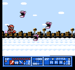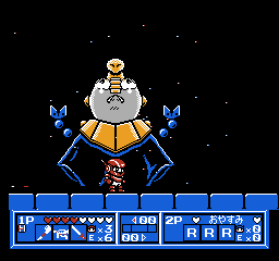 The levels this time around are completely linear, and while some may miss the exploration element of the first, the flow of the game works better as a straight-up action-platformer. Admittedly, things start out slow with the first level, which automatically scrolls at a sluggish pace; however, the autoscrolling is justified for the second segment of the stage where Rikkuru commands a small jet fighter in a Gradius-like shoot-em-up sequence. Things take off at stage two, an affectionate homage of the Goemon series set in feudal-era Edo with soldiers wearing helicopter helmets as propellers, ballerina sumo wrestlers, and a pogo stick samurai as the boss. Stages four, five, seven, and nine are also platformers, respectively based off the origins of Bill (an alien-ridden jungle), Upa (a delicious candy land), Fuuma (the Makai) and Simon (an ominous castle). The final stretch contains small versions of familiar bosses from each characters’ series (like the Cyclops from Castlevania III) before you reach the last battle with Warumon, who is super-simple to defeat as Bill.