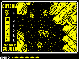 The ZX Spectrum and Amstrad CPC versions released as Outlaw in the UK by Players Premier are even worse. The standard walking speed is now excruciatingly slow, bullets hardly do any damage and the sound effects are gone entirely. At least the stages are colored differently and thus are now somewhat distinguishable from each other. They’re also much shorter. The C64 port, on the other hand, is very close to the 16 bit versions, aside from making the villains on the wanted posters more offensive racial stereotypes.