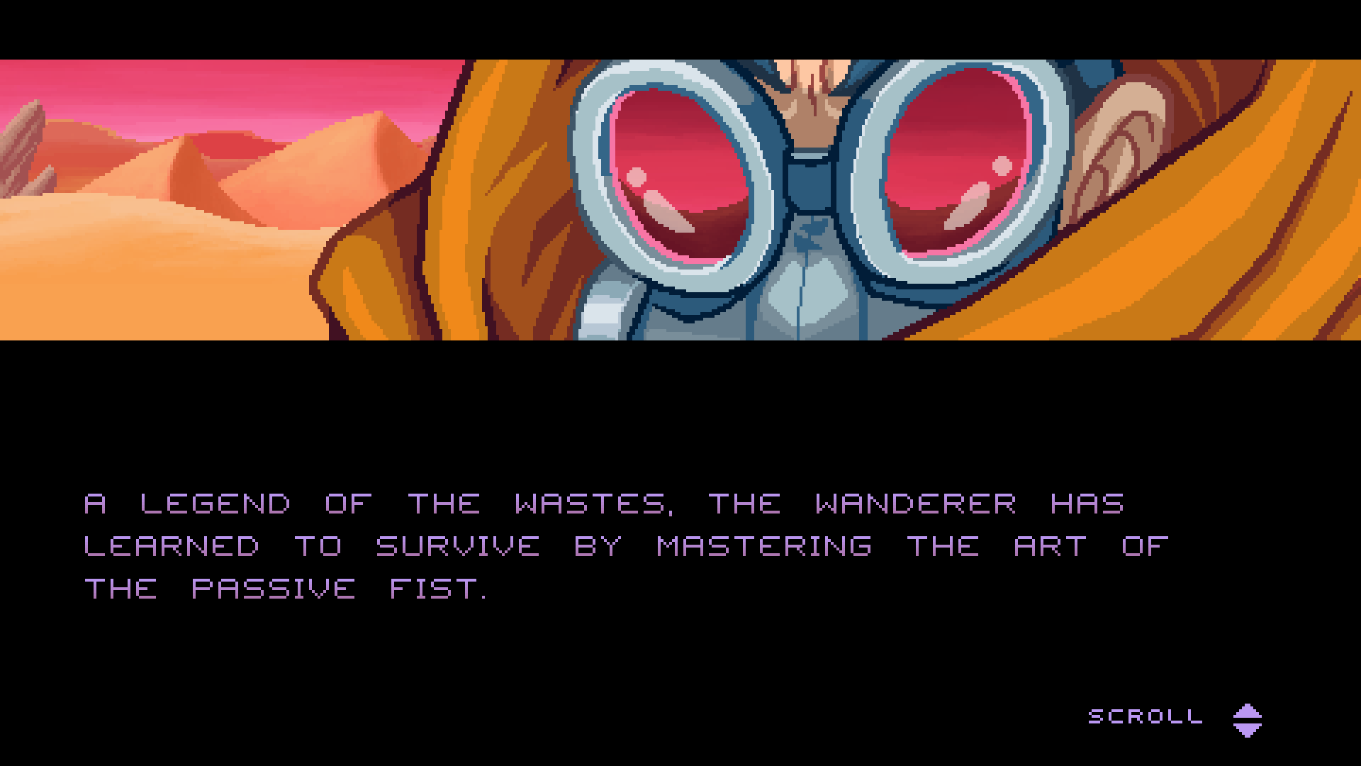 The planet Zircon V is dying under the heat of its massive sun, turning the former mining colony into an apocalyptic wasteland. When raiders attack a nearby settlement, a reclusive martial artist known as The Wanderer sets off to defeat them. Eventually, he soon learns that a mad doctor is planning to terrorize the wastes with an army of his own creation, setting the wanderer on a journey to infiltrate the evil scientist’s tower. Through the animated cutscenes that play between stages, more details on the wanderer’s past and the planet he lives on are gradually revealed. It’s not the most complicated of plots, but it does enough of a job of giving enough context to tie each of the ten stages together.