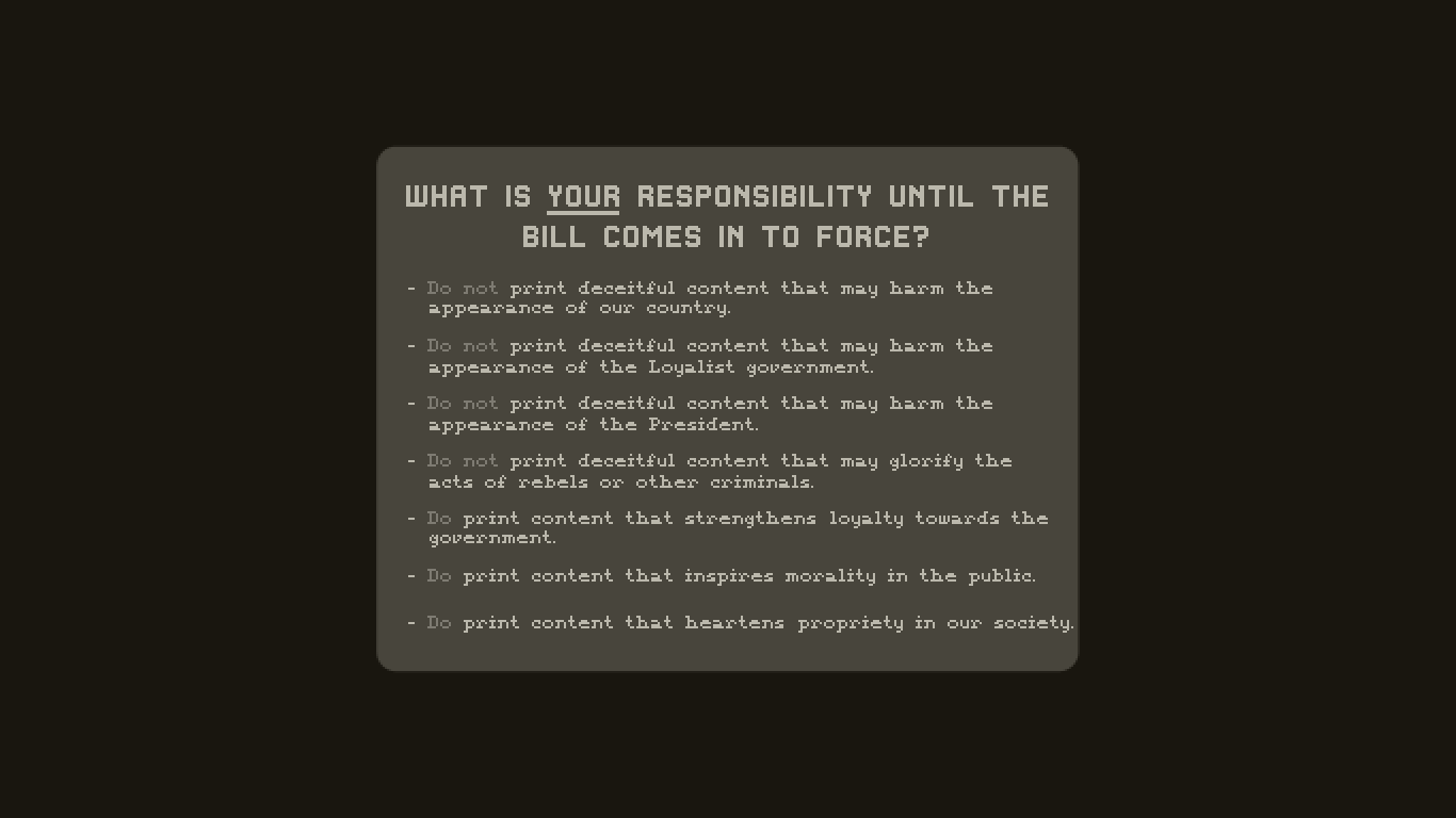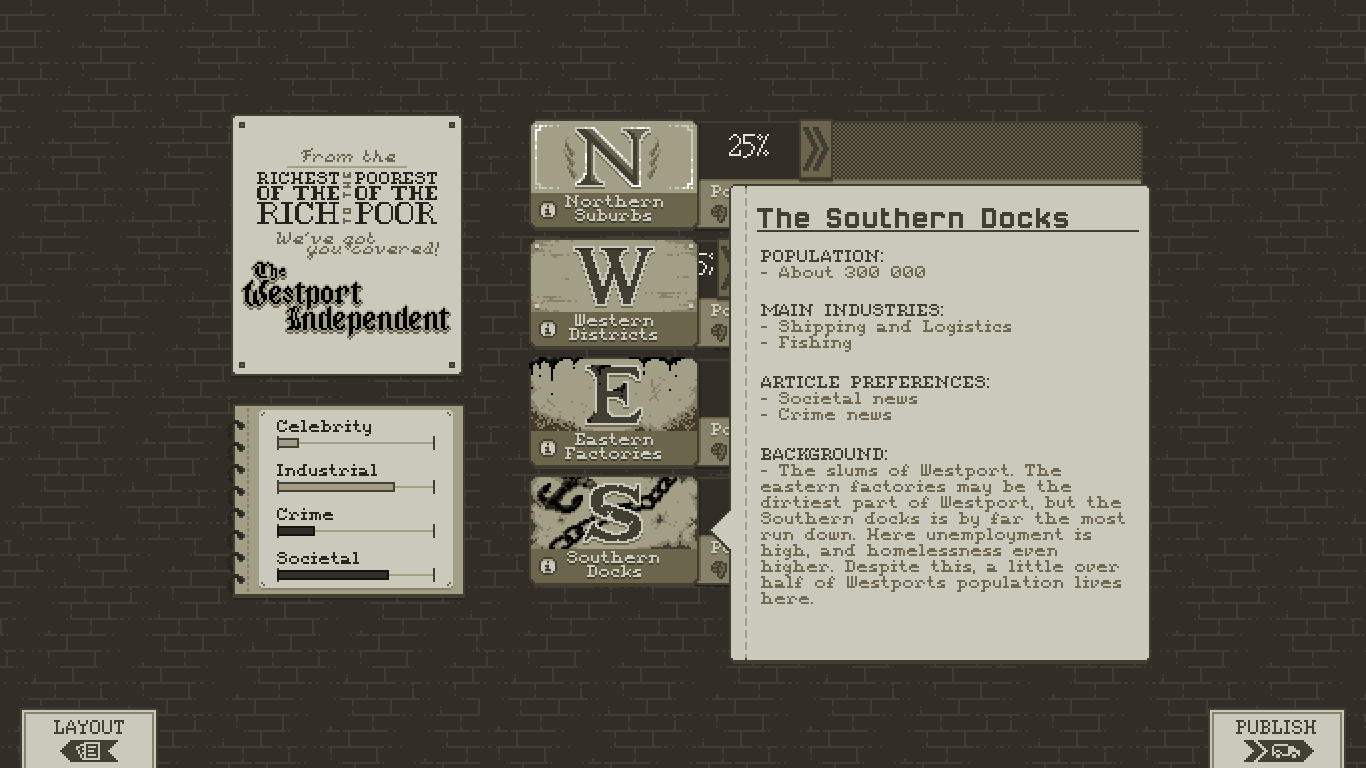 You also have final say on context as editor. You can select the headlines, ranging from by the fact to sensationalist, propagandist to rebellious (occasionally in very funny extremes). You can also choose to remove certain parts of the story that don’t fit the story you want to tell, or may upset the wrong people. The ultimate goal is to try and spark rebellion by slowly leaking out truthful information on what’s happening revolving around the government without getting them too suspicious of you, affecting each of the four districts, all with their own tastes in stories to cater to. Or, you can just be a bootlicker and bad things happen to most everyone, but you stay in business (though you can also survive if you get enough districts in revolt).